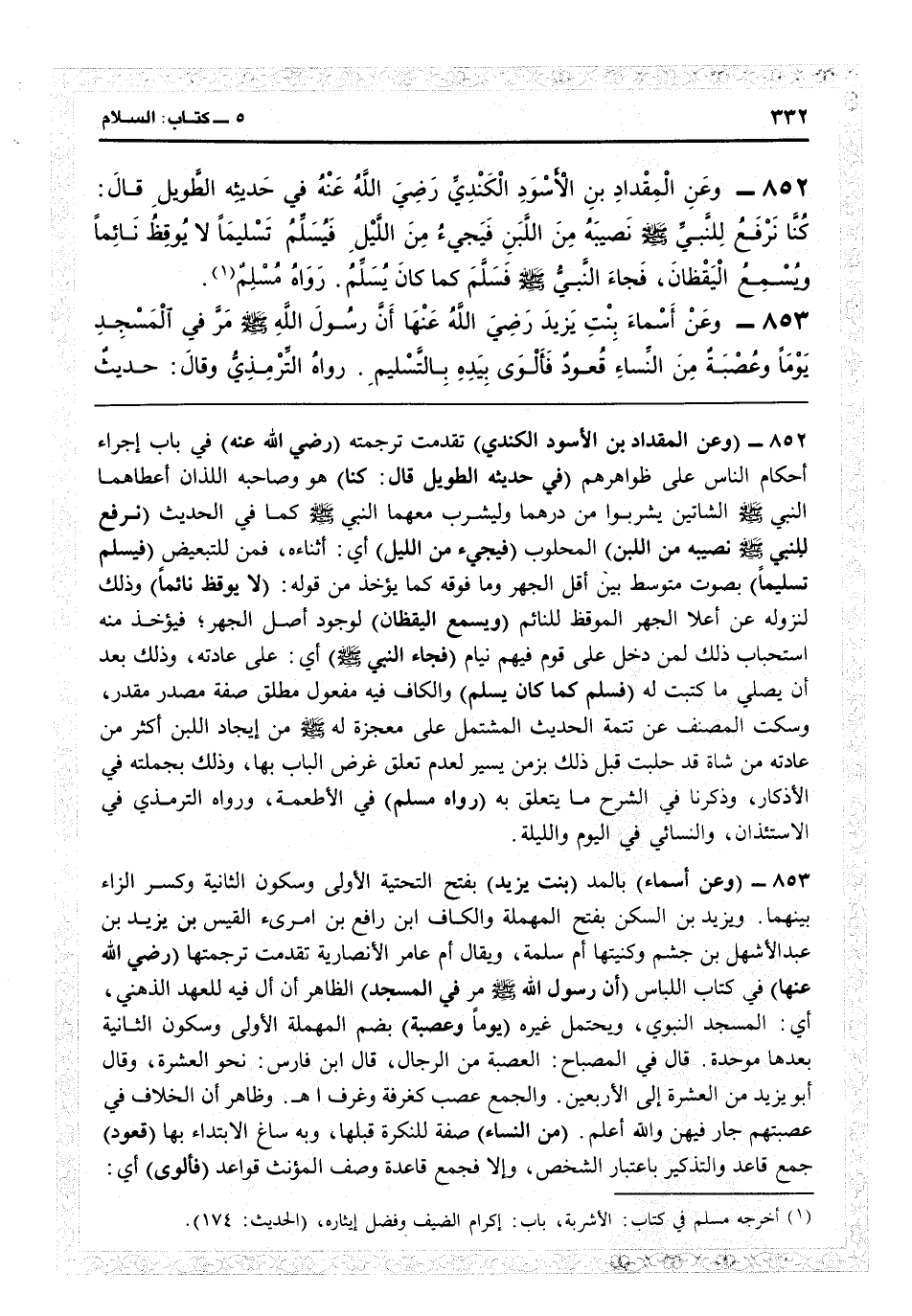5855 - (وعن أسماء) بالمد (بنت يزيد) بفتح التحتية الأولى وسكون الثانية وكسر الزاي بينهما ويزيد بن السكن بفتح المهملة والكاف ابن رافع بن امرىء القيس بن يزيد بن عبد الأشهل ابن جشم، وكنيتها أم سلمة، ويقال أم عامر الأنصارية تقدمت ترجمتها (رضي الله عنها) في كتاب اللباس (أن رسول الله مر في المسجد) الظاهر أن أل فيه للعهد الذهني: أي المسجد النبوي ويحتمل غيره (يوماً وعصبة) بضم المهملة الأولى وسكون الثانية بعدها موحدة قال في «المصباح» : العصبة من الرجال قال ابن فارس: نحو العشرة، وقال أبو يزيد: من العشرة إلى الأربعين، والجم عصب كغرفة وغرف اهـ. وظاهر أن الخلاف في عصبتهم جار فيهن والله أعلم. (من النساء) صفة للنكرة قبلها وبه ساغ الابتداء بها (قعود) جمع قاعد والتذكير باعتبار الشخص وإلا فجمع قاعدة وصف المؤنث قواعد (فألوى) أي