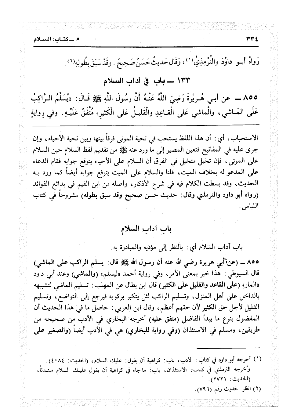 1857 - (عن أبي هريرة رضي الله عنه أن رسول الله قال: يسلم الراكب علة الماشي) قال السيوطي: هذا خبر بمعنى الأمر وفي رواية أحمد ليسلم (والماشي) وعند أبي داود: المارّ (على القاعد والقليل على الكثير) قال ابن بطال عن المهلب: تسليم الماشي لتشبيهه بالداخل على أهل المنزل وتسليم الراكب لئلا يتكبر بركوبه فيرجع إلى التواضع وتسليم القليل لأجل حق الكثير لأن حقهم أعظم. وقال ابن العربي: حاصل ما في هذا الحديث أن المفضول بنوع مَّا يبدأ الفاضل (متفق عليه) أخرجه البخاري في الأدب من «صحيحه» من طريقين ومسلم في الاستئذان (وفي رواية للبخاري) هي في الأدب أيضاً (والصغير على