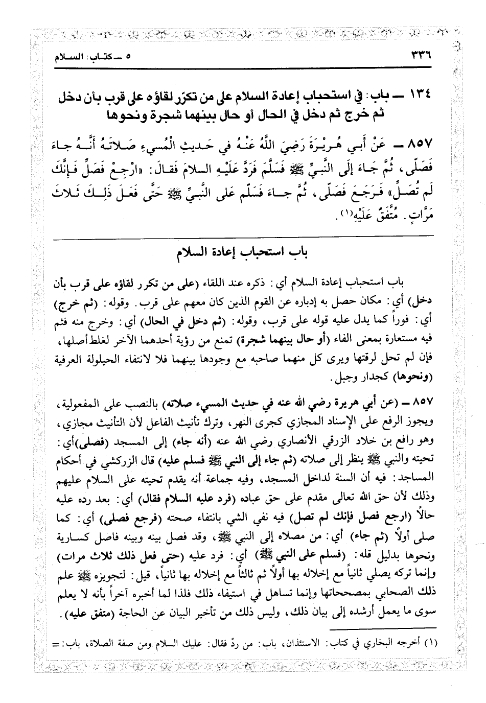1859 - (وعن أبي هريرة رضي الله عنه في حديث المسيء صلاته) بالنصب على المفعولية ويجوز الرفع على الإسناد كجري النهر وترك تأنيث الفاعل لأن التأنيث مجازي وهو رافع ابن خلاد الزرقي الأنصاري رضي الله عنه (أنه جاء) إلى المسجد (فصلى) أي تحيته والنبي ينظر إلى صلاته (ثم جاء إلى النبي) قال الزركشي في أحكام المساجد: فيه أن السنة لداخل المسجد، وفيه جماعة أنه يقدم تحيته على السلام عليهم وذلك لأن حتى الله تعالى مقدم على حق عباده (فرد عليه السلام فقال) أي بعد رده عليه حالاً (ثم جاء) أي من مصلاه إلى النبي وقد فصل بينه وبينه فاصل كسارية ونحوها بدليل قوله (فسلم على النبي) أي فرد عليه (حتى فعل ذلك ثلاث مرات) وإنما تركه يصلي ثانياً مع إخلاله بها أولاً ثم ثالثاً مع إخلاله بها ثانياً قيل لتجويزه ذلك الصحابي بمصححاتها، وإنما تساهل في استيفاء ذلك فلذا لما أخبره آخراً بأنه لا يعلم سوى ما يعمل أرشده إلى بيان ذلك وليس ذلك من تأخير البيان عن الحاجة (متفق عليه) .