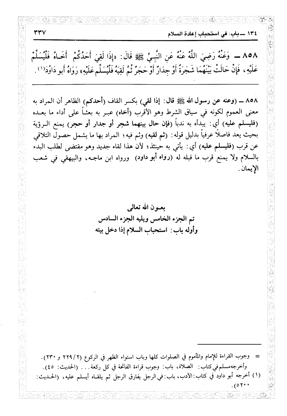 2860 - (وعنه عن رسول الله قال: إذا لقي) بكسر القاف (أحدكم) والظاهر أن المراد به معنى العموم لكونه في سياق الشرط وهو الأقرب (أخاه) عبر به بعثاً على أداء ما بعده (فليسلم عليه) أي يبدأ به ندباً (فإن حال بينهما شجر أو جدار أو حجر) يمنع الرؤية بحيث يعد فاصلاً عرفياً بدليل قوله (ثم لقيه) وثم فيه المراد بها ما يشمل حصول التلاقي عن قرب (فليسلم عليه) أي يأتي به حينئذ لأن هذا لقاء جديد وهو مقتضي لطلب البدء بالسلام ولا يمنع قرب ما قبله له (رواه أبو داود) ورواه ابن ماجه والبيهقي في «شعب الإيمان» .