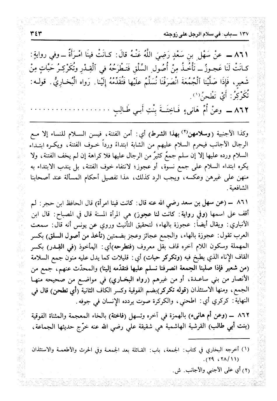 1863 - (عن سهل بن سعد رضي الله عنه قال كانت فينا امرأة) قال الحافظ ابن حجر: لم أقف على اسمها (وفي رواية كانت لنا عجوز) هي المرأة المسنة، قال في «المصباح» : قال ابن الانباري: ويقال أيضاً عجوزة بالهاء لتحقيق التأنيث. وروى عن يونس أنه قال: سمعت العرب تقول عجوزة بالهاء والجمع عجائز وعجز بضمتين (تأخذ من أصول السلق) بكسر بكسر المهملة وسكون اللام آخره قاف: بقل معروف (فتطرحه) أي المأخوذ (في القدر) بكسر القاف: الإناء الذي يطبخ فيه (وتكركر حبات) أي قليلات كما يدل عليه منون جمع السلامة (من شعير، فإذا صلينا الجمعة انصرفنا نسلم عليها فتقدمه إلينا) والمحدث عنهم جمع من الأنصار من بني ساعدة أو من غيرهم (رواه البخاري) في مواضع من «صحيحه» منها الجمع ومنها الاستئذان (قوله تكركر) بضم الفوقية وكسر الكاف الثانية (أي تطحن) قال في «النهاية» كركرى أي اطحنى، والكركرة: صوت يردده الإنسان في جوفه.