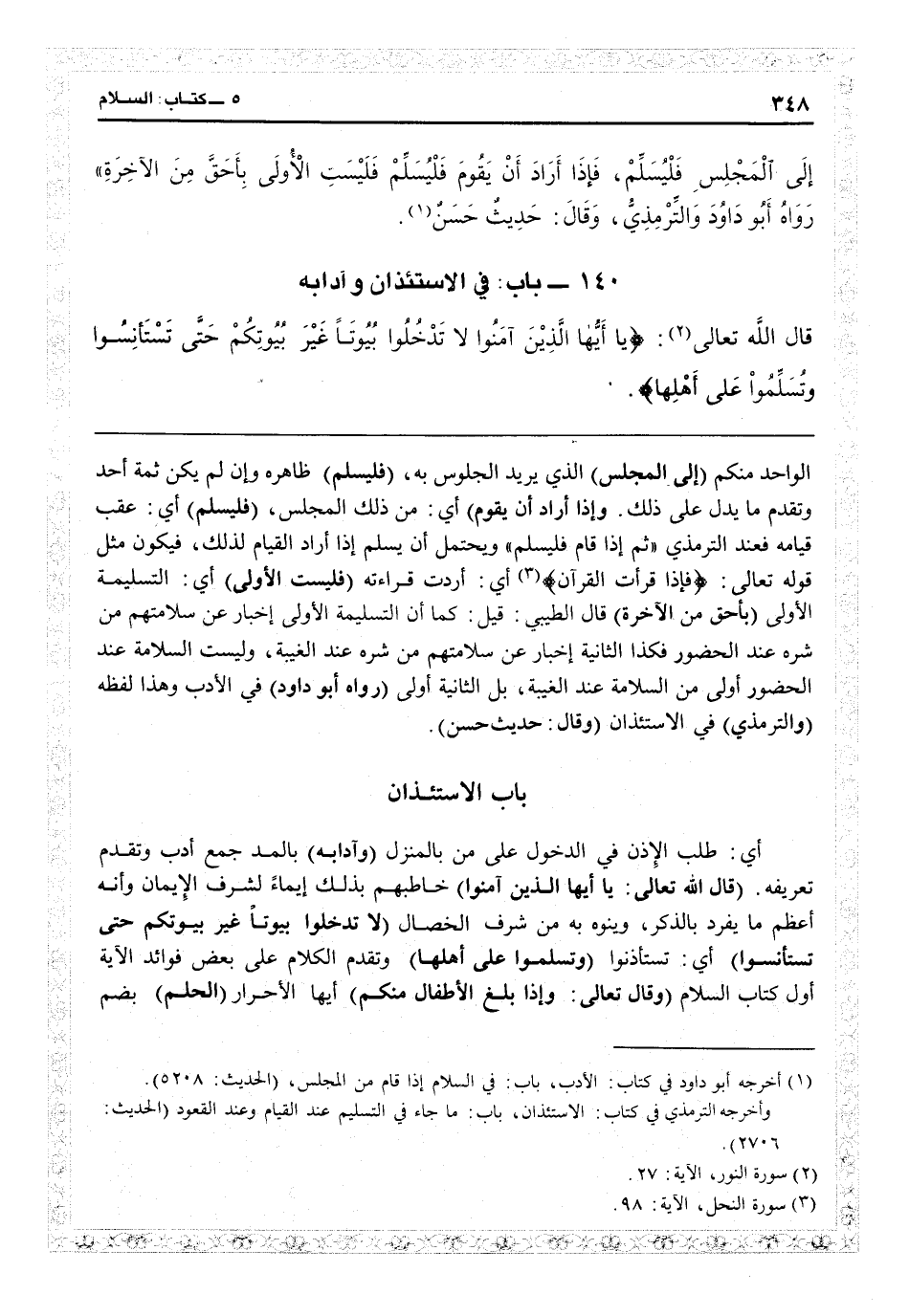 أي طلب الإذن في الدخول على من بالمنزل (وآدابه) بالمد جمع أدب وتقدم تعريفه. (قال الله تعالى) : ( {يا أيها الذين آمنوا} ) خاطبهم بذلك إيماء لشرف الإيمان وأنه أعظم ما يفرد بالذكر وينوه به من شرف الخصال ( {لا تدخلوا بيوتاً غير بيوتكم حتى تستأنسوا} ) أي تستأذنوا ( {وتسلموا على أهلها} ) وتقدم الكلام على بعض فوائد الآية أول كتاب السلام.