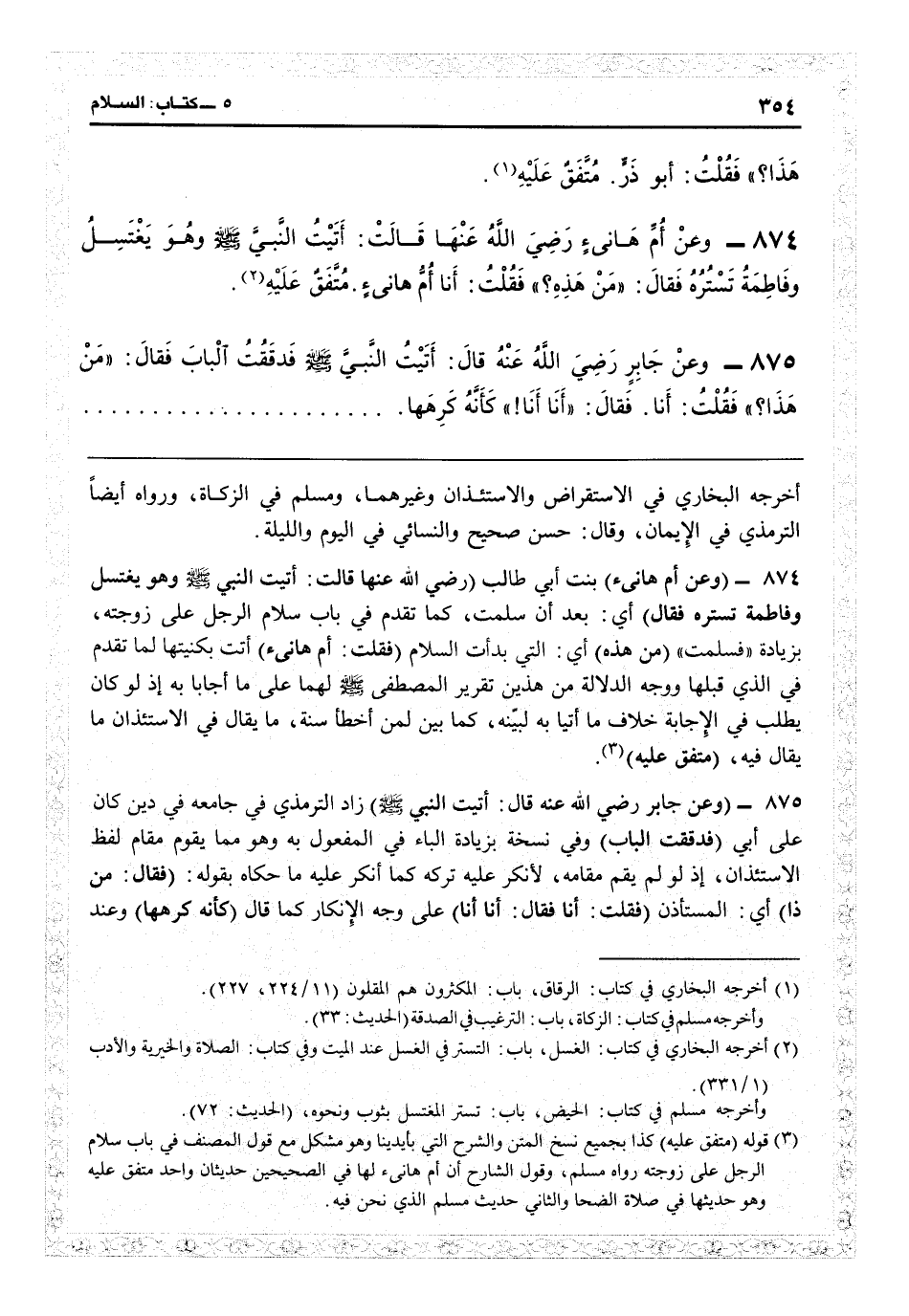 3876 - (وعن أم هانىء) بنت أبي طالب (رضي الله عنها قالت: أتيت النبي وهو يغتسل وفاطمة تستره فقال) أي بعد أن سلمت كما تقدم في باب سلام الرجل على زوجته بزيادة فسلمت (من هذه) أي التي بدأت السلام (فقلت: أم هانىء) أتت بكنيتها لما تقدم في الذي قبلها. ووجه الدلالة من هذين تقرير المصطفى لهما على ما أجابا به، إذا لو كان يطلب في الإجابة خلاف ما أتيا به لبينه كما بين لمن أخطأ سنة ما يقال في الاستئذان ما يقال فيه (متفق عليه) .