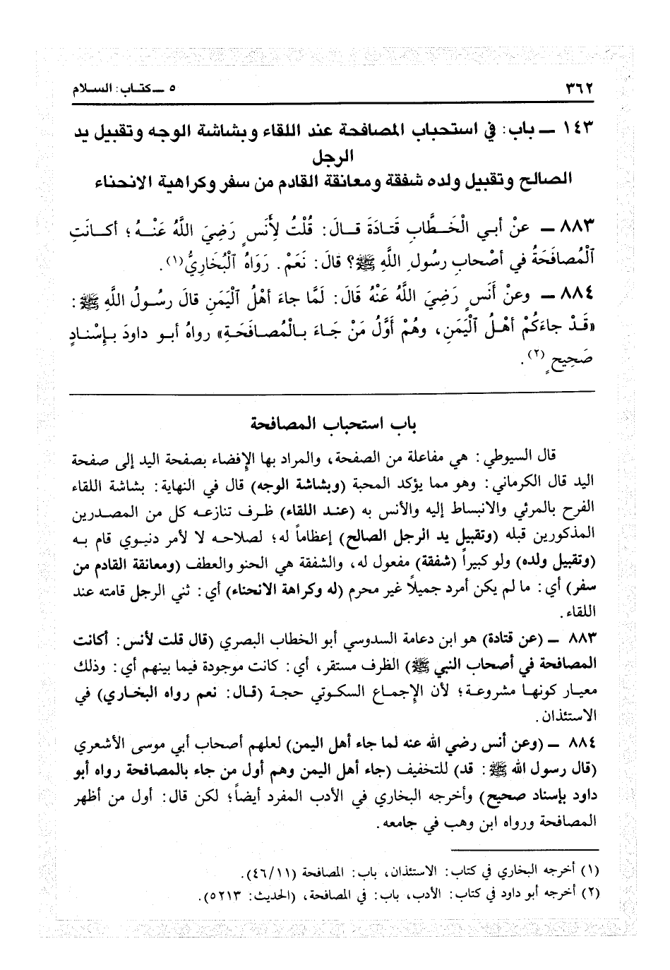 قال السيوطي: هي مفاعلة من الصفحة والمراد بها الإفضاء بصفحة اليد إلى صفحة اليد قال الكرماني: وهو مما يؤكد المحبة (وبشاشة الوجه) قال في «النهاية» : بشاشة اللقاء الفرح بالمرئى والانبساط إليه والأنس به (عند اللقاء) ظرف تنازعه كل من المصدرين المذكورين قبله (وتقبيل يد الرجل الصالح) إعظاماً له لصلاحه لا لأمر دنيوي قام به (وتقبيل ولده) ولو كبيراً (شفقة) مفعول له والشفقة هي الحنو والعطف (ومعانقة القادم من سفر) أي ما لم يكن أمرد جميلاً غير محرم له (وكراهة الانحناء) أي ثنى الرجل قامته عند اللقاء.