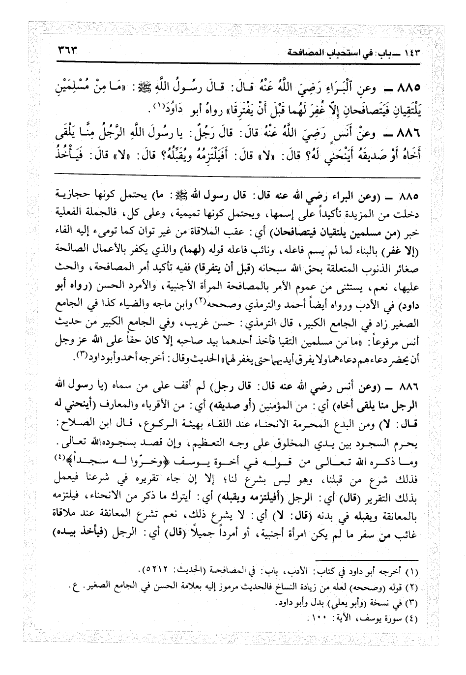3887 - (وعن البراء رضي الله عنه قال: قال رسول الله: ما) يحتمل كونها حجازية دخلت من المزيدة تأكيداً على اسمها ويحتمل كونها تميمية، وعلى كل فالجملة الفعلية خبر (من مسلمين يلتقيان فيتصافحان) أي عقب الملاقاة من غير توان كما تومىء إليه الفاء (إلا غفر) بالبناء لما لم يسم فاعله ونائب فاعله قوله (لهما) والذي يكفر بالأعمال الصالحة صغائر الذنوب المتعلقة بحق الله سبحانه (قبل أن يتفرقا) ففيه تأكيد أمر المصافحة والحث عليها، نعم يستثنى من عموم الأمر بالمصافحة المرأة الأجنبية والأمرد الحسن (رواه أبو داود) في الأدب، ورواه أيضاً أحمد والترمذي وصححه وابن ماجه والضياء كذا في «الجامع الصغير» ، زاد في «الجامع الكبير» قال الترمذي: حسن غريب، وفي «الجامع الكبير» من حديث أنس مرفوعاً «ما من مسلمين التقيا فأخذ أحدهما بيد صاحبه إلا كان حقاً على الله عز وجل أن يحضر دعاءهما ولا يفرق أيديهما حتى يغفر لهما» الحديث، وقال: أخرجه أحمد وأبو داود.