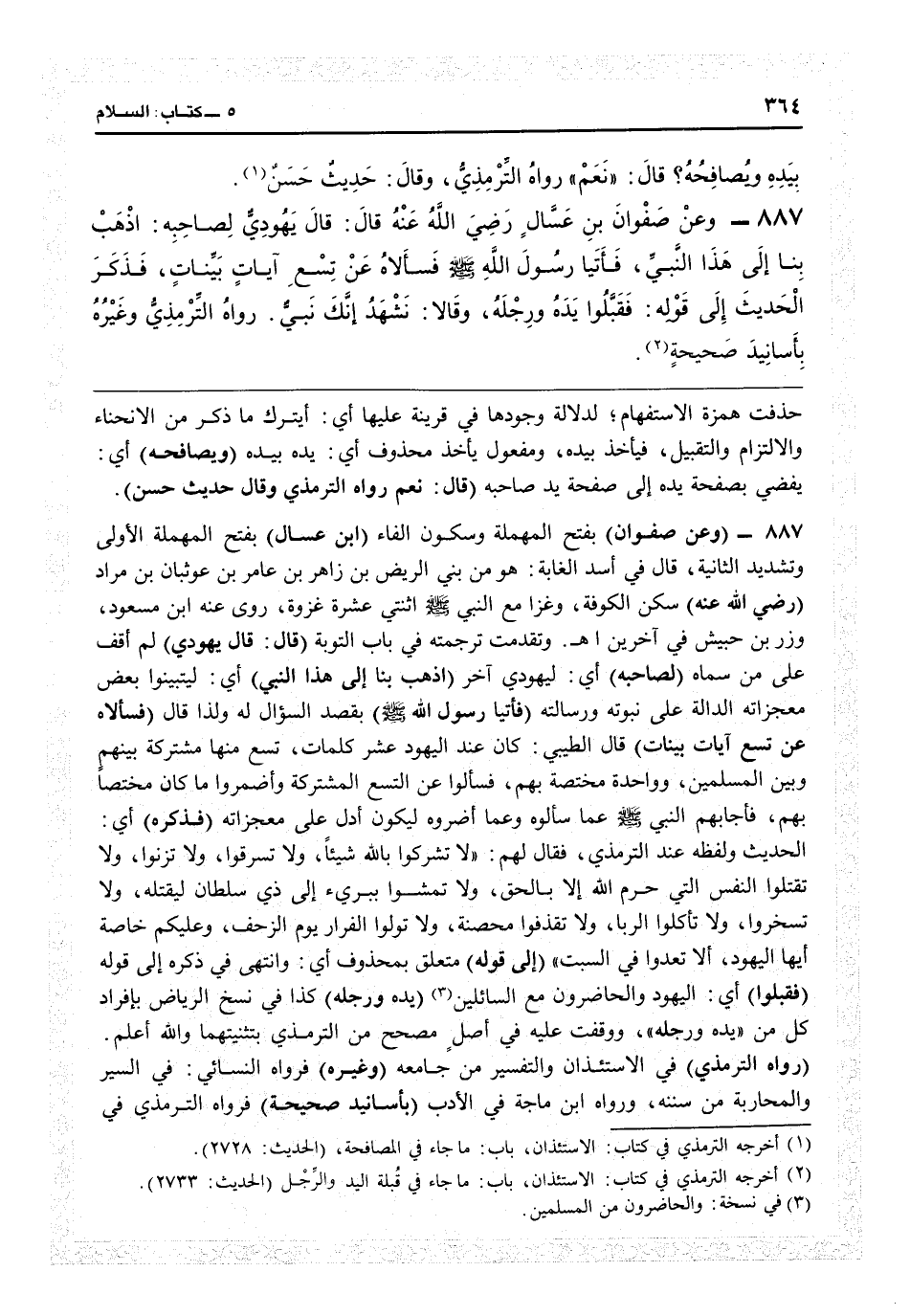 5889 - (وعن صفوان) بفتح المهملة وسكون الفاء (انب عسال بفتح المهملة الأولى وتشددي الثانية قال في أسد الغابة: هو من بني الريض بن زاهر بن عامر بن عوثبان بن مراد رضي الله عنه) سكن الكوفة وغزى مع النبي اثنتي عشرة غزوة، روى عنه ابن مسعود وزر بن حبيش في آخرين اهـ. وتقدمت ترجمته في باب التوبة (قال: قال يهودي) لم أقف على من سماه (لصاحبه) أي ليهودي آخر (ذهب بنا إلى هذا النبي) أي ليتبينوا بعض معجزاته الدالة على نبوته ورسالته (فأتيا رسول الله) بقصد السؤال له ولذا قال (فسألاه عن تسع آيات بينات) قال الطيبي: كان عند اليهود عشر كلمات تسع منها مشتركة بينهم وبين المسلمين وواحدة مختصة بهم، فسألوا عن التسع المشتركة وأضمروا ما كان مختصاً بهم، فأجابهم النبي عما سألوه وعما أضمروه ليكون أدلّ على معجزاته (فذكره) أي الحديث ولفظه عند الترمذي «فقال لهم لا تشركوا بالله شيئاً، ولا تسرقوا، ولا تزنوا، ولا تقتلوا النفس التي حرم الله إلا بالحق، ولا تمشوا ببرىء إلى ذي سلطان ليقتله، ولا تسحروا، ولا تأكلوا الربا، ولا تقذفوا محصنة، ولا تولوا الفرار يوم الزحف، وعليكم خاصة أيها اليهود ألا تعدوا في السبت» (إلى قوله) متعلق بمحذوف: أي وانتهى في ذكره إلى قوله (فقبلوا) أي اليهود والحاضرون مع السائلين (يده ورجله) كذا في نسخ «الرياض» بأفراد كل من «يده ورجليه» ووقفت عليه في أصل مصحح من الترمذي بتثنيتهما والله أعلم (رواه الترمذي) في الاستئذان والتفسير من «جامعه» (وغيره) فرواه النسائي في السير والمحاربة في «سننه» ، ورواه ابن ماجه في الأدب (بأسانيد صحيحة) فرواه الترمذي في