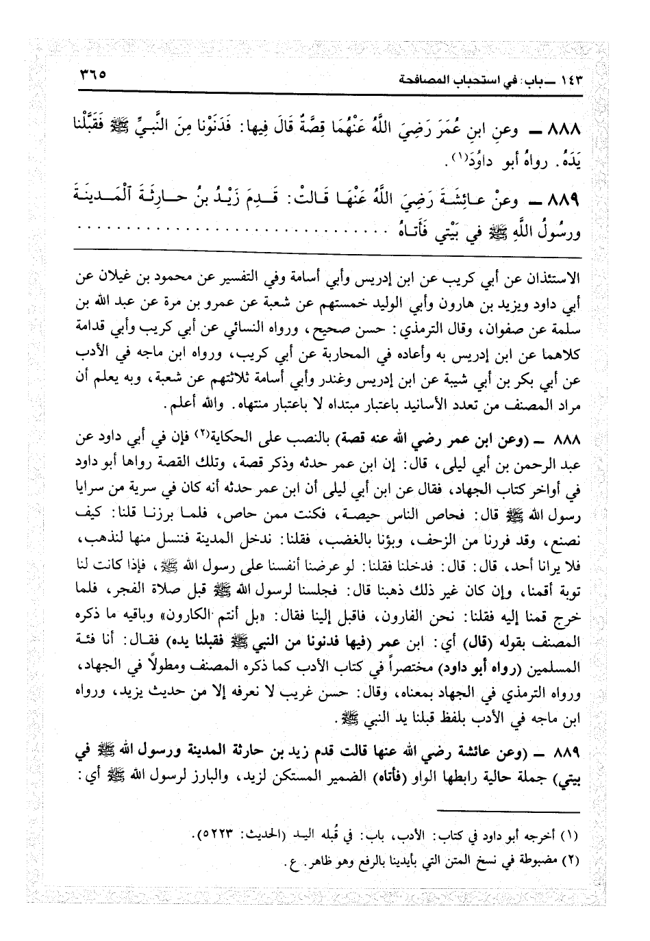 6890 - (وعن ابن عمر رضي الله عنهما قصة) بالنصب على الحكاية، أن في أبي داود عن عبد الرحمن بن أبي ليلى قال «إن ابن عمر حدثه وذكر قصة» وتلك القصة رواها أبو داود في أواخر كتاب الجهاد فقال عن أبي ليلى أن ابن عمر حدثه «أنه كان في سرية من سرايا رسول الله، قال: فحاص الناس حيصة فكنت ممن حاص، فلما برزنا قلنا: كيف نصنع وقد فررنا من الزحف وبؤنا بالغضب؟ فقلنا لدخل المدينة فننسل منها لذهب فلا يرانا أحد، قال: قال فدخلنا فقلنا لو عرضنا أنفسنا على رسول الله فإذا كانت لنا توبة أقمنا وإن كان غير ذلك ذهبنا، قال: فجلسنا لرسول الله قبل صلاة الفجر، فلما خرج قمنا إليه فقلنا: نحن الفارّون، فأقبل إلينا فقال: بل أنتم الكارّون» وباقيه ما ذكره المصنف بقوله (قال) أي ابن عمر (فيها فدنونا من النبي فقلبنا يده) فقال: إنا فئة المسلمين (رواه أبو داود) مختصراً في كتاب الأدب كما ذكره المصنف ومطولاً في الجهاد، ورواه الترمذي في الجهاد بمعناه وقال: حسن غريب لا نعرفه إلا من حديث يزيد، ورواه ابن ماجه في الادب بلفظ قبلنا يد النبي.