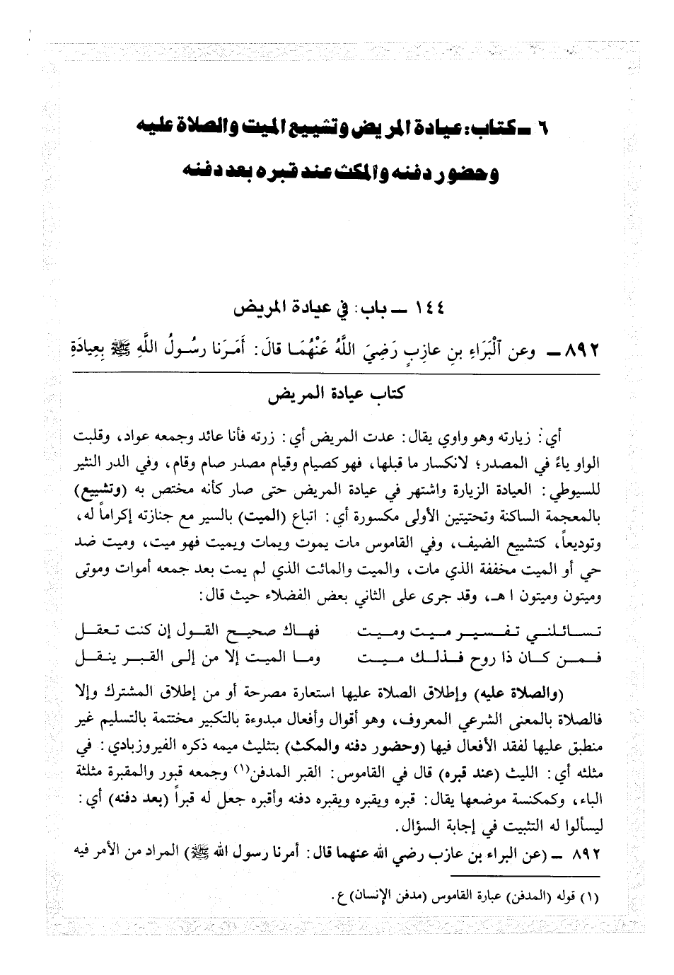 أي زيارته وهو واوي يقال عدت المريض: أي زرته فأنا عائد وجمعه عواد، وقلبت الواو ياء في المصدر لانكسار ما قبلها فهو كصيام وقيام مصدر صام وقام. وفي «الدر المنثور» للسيوطي: العيادة الزيارة واشتهر في عيادة المريض حتى صار كأنه مختص به (وتشييع) بالمعجمة الساكنة وتحتيتين الأولى مكسورة: أي اتباع (الميت) بالسير مع جنازته إكراماً له وتوديعاً كتشييع الضيف. وفي «القاموس» : مات يموت ويمات ويميت فهو ميت وميت ضد حيّ أو الميت مخففة الذي مات، والميت والمائت الذي لم يمت بعد، جمعه أموات وموتى وميتون وميتون اهـ. وقد جرى على الثاني بعض الفضلاء حيث قال: