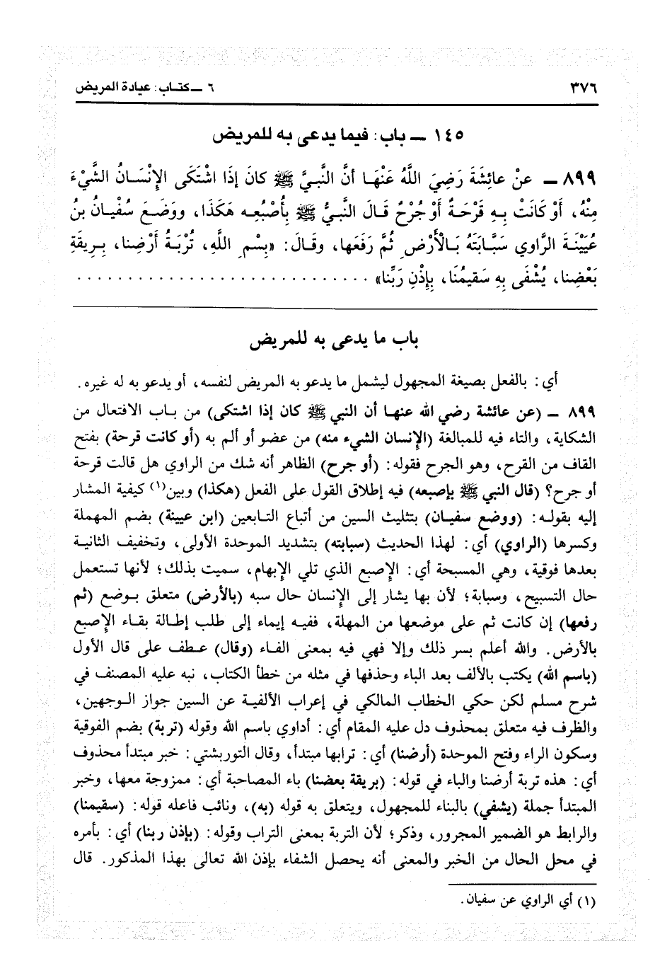 1901 - (عن عائشة رضي الله عنه أن النبي كان إذا اشتكى) من باب الافتعال من الشكاية والتاء للمبالغة (الإنسان الشيء منه) من عضو ألم به (أو كانت قرحة) بفتح القاف من القرح وهو الجرح، فقوله (أو جرح) الظاهر أنه شك من الراوي هل قالت قرحة أو جرح (قال النبي بأصبعه) فيه إطلاق القول على الفعل (هكذا) وبين كيفية المشار إليه بقوله (ووضع سفيان) بتثليث السين من أتباع التابعين (ابن عيينة) بضم المهملة وكسرها (الراوي) أي لهذا الحديث (سبابته) بتشديد الموحدة الأولى وتخفيف الثانية بعدها فوقية وهي السبحة أي الأصبع التي تلي الإبهام، سميت بذلك لأنها تستعمل حال التسبيح، وسبابة لأنها بها يشار إلى الإنسان حال سبه (بالأرض) متعلق بوضع (ثم رفعها) إن كانت ثم على موضوعها من المهملة ففيه إيماء إلى طلب إطالة بقاء الأصبع بالأرض والله أعلم بسر ذلك وإلا فهي فيه بمعنى الفاء (وقال) عطف على قال الأول (باسم الله) يكتب بالألف بعد الباء وحذفها في مثله من خطأ الكتاب نبه عليه المصنف في «شرح مسلم» ، لكن حكى الخطابي المالكي في إعراب الألفية عن السمين جواز الوجهين، والظرف فيه متعلق بمحذوف دل عليه المقام: أي أداوي باسم الله، وقوله (تربة) بضم الفوقية وسكون الراء وفتح الموحدة (أرضنا) أي ترابها مبتدأ، وقال التوربشتي: خبر مبتدأ محذوف: أي هذه تربة أرضنا، والباء في قوله (بريقة بعضنا) باء المصاحبة: أي ممزوجة معها وخبر المبتدأ جملة (يشفي) بالبناء للمجهول ويتعلق به قوله (به) ونائب فاعله قوله (سقيمنا) والرابط هو الضمير المجرور وذكر لأن التربة بمعنى التراب، وقوله (بإذن ربنا) أي بأمره محل الحال من الخبر. والمعنى أنه يحصل الشفاء بإذن الله تعالى بهذا المذكور، قال
