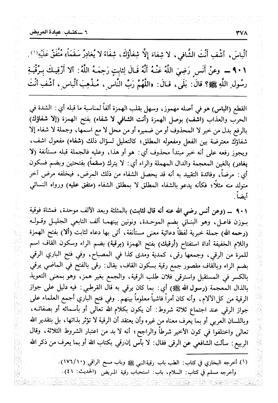 القطع (الباس) هو في أصله مهموزاً وسهل بقلب الهمزة ألفا لمناسبة ما قبله: أي الشدة في الحرب والعذاب (اشف) بوصل الهمزة (أنت الشافي لاشفاء) بفتح الهمزة (إلا شفاؤك) بالرفع بدل من خبر لا المحذوف أو من ضميره أو من محل لا مع اسمها، وجملة لا شفاء إلا شفاؤك معترضة بين الفعل ومفعوله المطلق كالتعليل لسؤال ذلك (شفاء) مفعول اشف، ويجوز رفعه على أنه خبر مبتدأ محذوف: أي هو أو هذا وعليه فالجملة قبله مستأنفة (لا يغادر) بالغين المعجمة والدال المهملة والراء: أي لا يترك (سقماً) بفتحتين وبضم فسكون: أي مرضاً، وفائدة التقييد به أنه قد يحصل الشفاء من ذلك المرض فيخلفه مرض آخر متولد منه مثلاً فكأنه يدعو بالشفاء المطلق لا بمطلق الشفاء (متفق عليه) ورواه النسائي أيضاً.