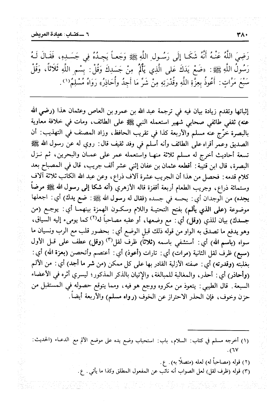 إثباتها وتقدم زيادة بيان فيه في ترجمة عبد الله بن عمرو بن العاص، وعثمان هذا (رضي الله عنه) ثقفى طائفي صحابي شهير استعمله النبي على الطائف ومات في خلافة معاوية بالبصرة خرج عنه مسلم والأربعة كذا في «تقريب الحافظ» ، وزاد المصنف في «التهذيب» أن الصديق وعمر أقراه على الطائف وأنه أسلم في وقد ثقيف، قال: روى له عن رسول الله تسعة أحاديث، أخرج له مسلم ثلاثة منها، واستعمله عمر على عمان والبحرين ثم نزل البصرة قال ابن قتيبة: أقطعه عثمان بن عفان اثني عشر ألف جريب. قال في «المصباح» بعد كلام قدمه فحصل من هذا أن الجريب عشرة آلاف ذراع، وعن عبد الله الكاتب ثلاثة آلاف وستمائة ذراع، وجريب الطعام أربعة أقفزة قاله الأزهري (أنه شكا إلى رسول الله مرضاً يجده) من الوجدان أي يحسه في جسده (فقال له رسول الله: ضع يدك) أي أجعلها موضوعة (على الذي يألم) بفتح التحتية واللام وسكون الهمزة بينهما: أي يوجع (من جسدك) بيان للذي (وقل) أي مع وضعها أو عقبه مصاحباً كما يومىء إليه السياق وهو يدفع ما تصدق به الواو من قوله ذلك قبل الوضع: أي بحضور قلب مع الربّ ونسيان ما سواه (باسم الله) أي استشفى باسمه (ثلاثاً) ظرف لقل (وقل) عطف على قل الأول (سبع) ظرف لقل الثانية (مرات) أي تارات (أعوذ) أعتصم وأتحصن (بعزّة الله) أي بغلبته (وقدرته) أي صفته الأزلية القادر بها على كل ممكن (من شر ما أجد) أي من الألم (وأحاذر) أي أحذر والمغالبة للمبالغة والإتيان بالذكر المذكور ليسرى أثره في الأعضاء السبعة. قال الطيبي، تعوذ من مكروه ووجع هو فيه ومما يتوقع حصوله في المستقبل من حزن وخوف فإن الحذر الاحتراز عن الخوف (رواه مسلم) والأربعة أيضاً.