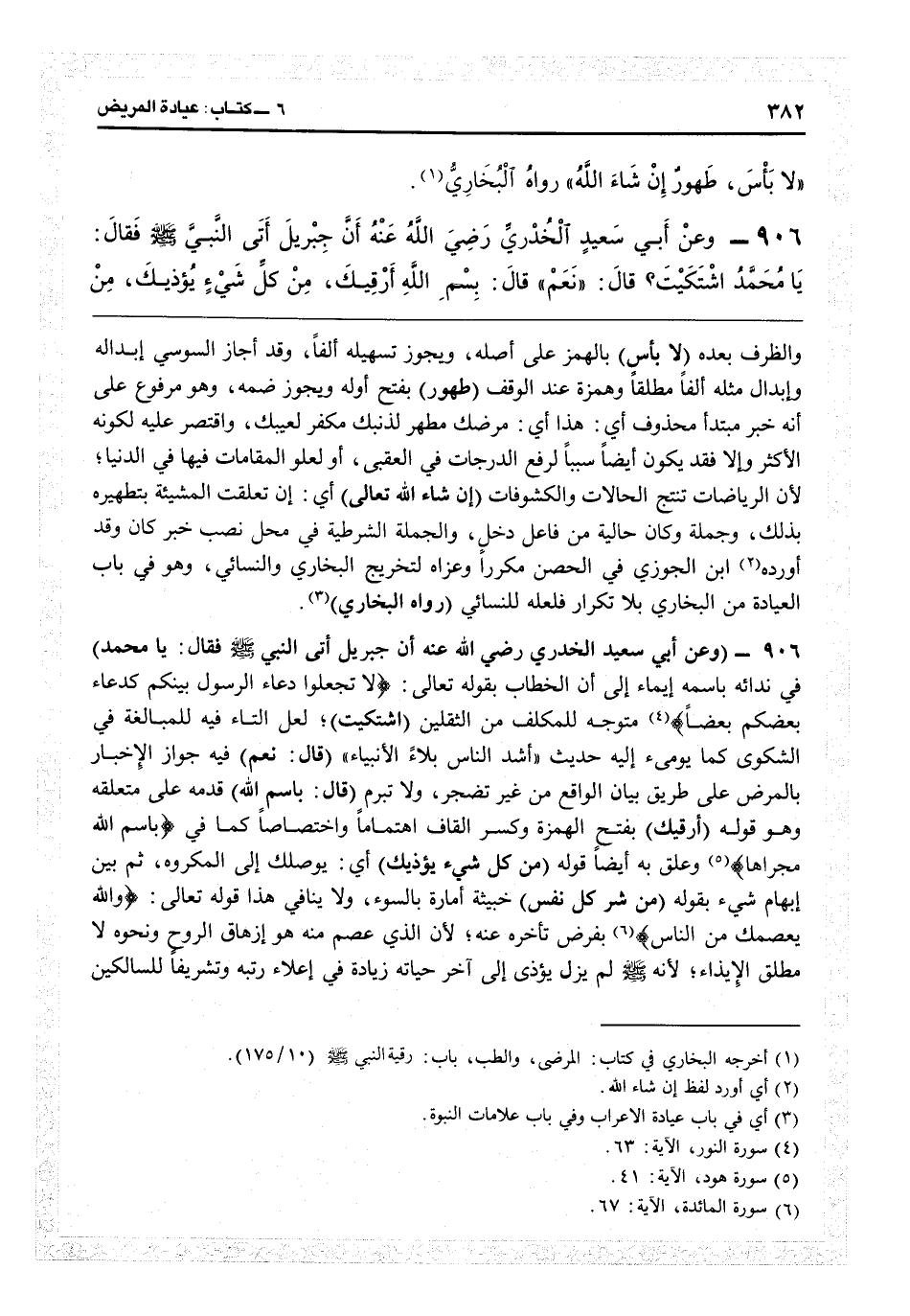 8908 - (وعن أبي سعيد الخدري رضي الله عنه أن جبريل أتى النبي فقال: يا محمد) في ندائه باسمه إيماء إلى أن الخطاب بقوله تعالى: {لا تجعلوا دعاء الرسول بينكم كدعاء بعضكم بعضاً} (النور: 63) متوجه للمكلف من الثقلين (اشتكيت) لعل التاء فيه للمبالغة في الشكوى. كما يومىء إليه حديث «أشد الناس بلاء الأنبياء (قال نعم) فيه جواز الإخبار بالمرض على طريق بيان الواقع من غير تضجر ولا تبرم (قال باسم الله) قدمه على متعلقه وهو قوله (أرقيك) بفتح الهمزة وكسر القاف اهتماماً واختصاصاً كما في بسم الله مجراها، وعلق به أيضاً قوله (من كل شيء يؤذيك) أي يوصلك إلى المكروه، ثم بين إبهام شيء بقوله (من شرّ كل نفس) خبيثة أمارة بالسوء ولا ينافي هذا قوله تعالى: {والله يعصمك من الناس} (المائدة: 6) بفرض تأخره عنه لأن الذي عصم منه هو إزهاق الروح ونحوه لا مطلق الإيذاء، لأنه لم يزل يؤذي إلى آخر حياته زيادة في إعلاء رتبه وتشريفاً للسالكين