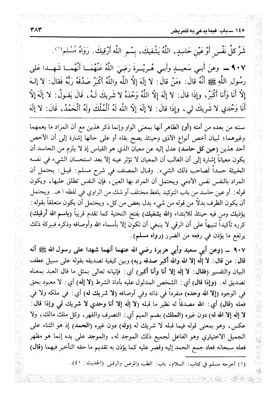 سننه من بعده من أمته (أو) الظاهر أنها بمعنى الواو، وإنما ذكر هين مع أن المراد ما يعمهما وغيرهما لبيان أخص أنواع الأذى وحينئذ يصح بقاء «أو» على حالها إشارة إلى أن الأخص أحد هذين (عين كل حاسد) عدل إليه عن معيان الذي هو القياس، إذا لا يلزم من الحاسد أن يكون معياناً إشارة إلى أن الغالب أن المعيان لا تؤثر عينه إلا بعد استحسان الشيء في نفسه الخبيثة حسداً لصاحب ذلك الشيء. وقال المصنف في «شرح مسلم» : قيل يحتمل أن المراد بالنفس نفس الآدمي. ويحتمل أن المراد بها العين فإن النفس تطلق عليها، ويكون قوله أو عين حاسد من باب التوكيد بلفظ مختلف أوشك من الراوي في لفظه اهـ. ويحتمل أن يكون الظرف بدلاً من قوله من شيء ما بدل بعض من كل، ويحتمل أن يكون متعلقاً بقوله يؤذيك ومن فيه حينئذ للابتداء (الله يشفيك) بفتح التحتية كما تقدم قريباً (باسم الله أرقيك) كرره تأكيداً تنبيهاً على أن الرقي لا تنبغي أن تكون إلا