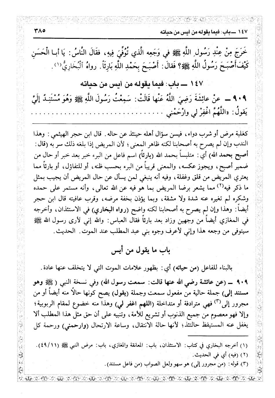 كغلبة مرض أو شرب دواء فيسن سؤال أهله حينئذ عن حاله، قال ابن حجر الهيتمي: وهذا الندب وإن لم يصرح به أصحابنا لكنه ظاهر المعنى لأن المريض إذا بلغه ذلك سرّ به (قال: أصبح بحمد الله) أي متلبساً بحمد الله (بارئاً) اسم فاعل من البرء خبر بعد خبر أو حال ضمير أصبح ويجوز عكسه، والمعنى قريباً من البرء بحسب ظنه، أو للتفاؤل أو بارئاً مما يعتري المريض من قلق وغفلة. وفيه أن ينبغي لمن يسأل عن حال المريض أن يجيب بمثل ما ذكره فيه مما يشعر برضا المريض بما هو فيه عن الله تعالى، وأنه مستمرّ على حمده وشكره لم نغيره عنه شدة ولا مشقة، وبما يؤذن بخفة مرضه وقرب عافيته: قال ابن حجر أيضاً: وهذا وإن لم يصرح به أصحابنا لكنه واضح (رواه البخاري) في الاستئذان، وأخرجه في المغازي أيضاً من وجهين وزاد بعد بارئاً، فقال العباس: «والله إني لأرى رسول الله سيتوفى من وجعه هذا، وإني لأعرف وجوه بني عبد المطلب عند الموت» الحديث.