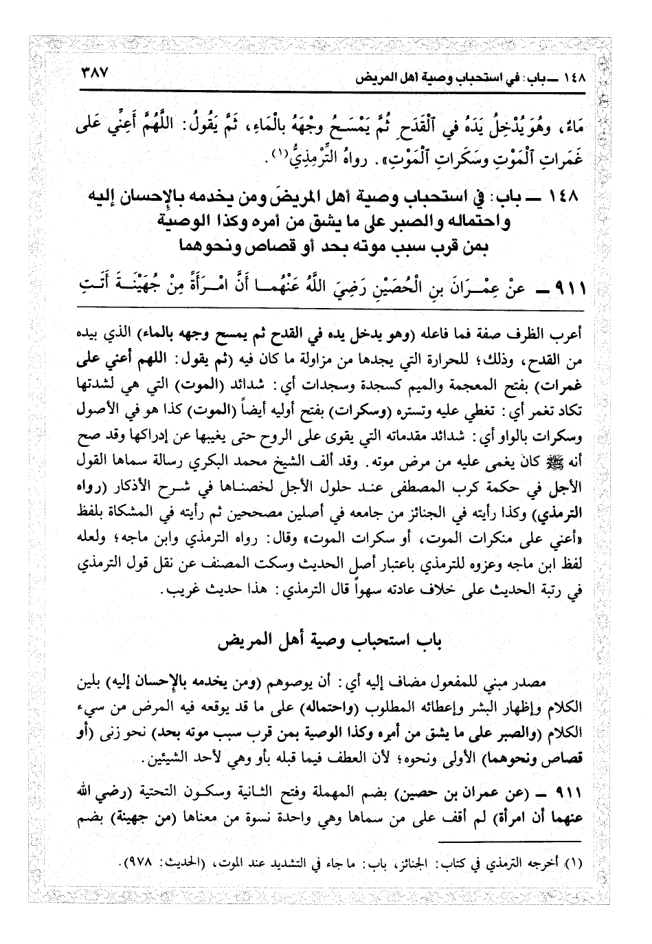 أعرب الظرف صفة فماء فاعله (وهو يدخل يده في القدح ثم يمسح وجهه بالماء) الذي بيده من القدح وذلك للحرارة التي يجدها من مزاولة ما كان فيه (ثم يقول: اللهم أعني على غمرات) بفتح المعجمة والميم كسجدة وسجدات: أي شدائد (الموت) التي هي لشدتها تكاد تغمر: أي تغطى عليه وتستره (وسكرات) بفتح أوليه أيضاً (الموت) كذا هو في الأصول وسكرات بالواو: أي شدائد مقدماته التي يقوي على الروح حتى يغيبها عن إدراكها وقد صح «أنه كان يعمى عليه من مرض موته» وقد ألف الشيخ محمد البكري رسالة سماها «القول الأجلّ في حكمة كرب المصطفى عند حلول الأجل» لخصناها في «شرح الأذكار» (رواه الترمذي) وكذا رأيته في الجنائز من «جامعه» في أصلين مصححين ثم رأيته في المشكاة بلفظ «أعنى على منكرات الموت أو سكرات الموت» وقال: رواه الترمذي وابن ماجه ولعله لفظ ابن ماجه، وعزوه للترمذي باعتبار أصل الحديث، وسكت المصنف عن نقل قول الترمذي في رتبة الحديث على خلاف عادته سهواً، قال الترمذي: هذا حديث غريب.