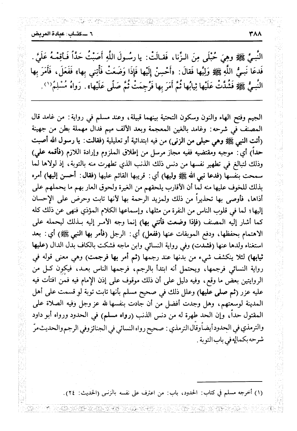 الجيم وفتح الهاء والنون وسكون التحتية بينهما: وعند مسلم في رواية «من غامد» قال المصنف في شرحه: وغامد بالغين المعجمة وبعد الألف ميم فدال مهملة. بطن من جهينة (أتت النبي وهي حبلى من الزنى) من فيه ابتدائية أو تعليمية (فقالت: يا رسول الله أصبت حداً) أي موجبه ومقتضيه. ففيه مجاز مرسل من إطلاق الملزوم وإرادة اللازم (فأقمه على) وذلك لتبالغ في تطهير نفسها من دنس ذلك الذنب الذي تطهرت منه بالتوبة إذ لولاها لما سمحت بنفسها (فدعا نبي الله وليها) أي قريبها القائم عليها (فقال: أحسن إليها) أمره بذلك للخوف عليها منه لما أن العار يلحقهم من الغيرة ولحوق العار بهم ما يحملهم على أذاها، فأوصى بها تحذيراً من ذلك، ولمزيد الرحمة بها لأنها تابت وحرض على الإحسان إليها لما في قلوب الناس من النفرة من مثلها وإسماعها الكلام المؤذي، فنهى عن ذلك كله كما أشار إليه المصنف (فإذا وضعت فأثنى بها) إنما وجه الأمر إليه بذلك ليحمله على الاهتمام بحفظها ودفع الموبقات عنها (ففعل) أي الرجل (فأمر بها النبي) أي بعد استغناء ولدها عنها (فشدت) وفي رواية النسائي وابن ماجه «فشكت» بالكاف بدل الدال (عليها ثيابها) لئلا ينكشف شيء من بدنها عند رجمها (ثم أمر بها فرجمت) وهي معنى قوله في رواية النسائي فرجمها، ويحتمل أنه ابتدأ بالرجم فرجمها الناس بعد فيكون كل من الروايتين بعض ما وقع. وفيه دليل على أن ذلك موقوف على إذن الإمام فيه فمن افتات فيه عليه عزر (ثم صلى عليها) وعلل ذلك في «صحيح مسلم» بأنها «تابت توبة لو قسمت على أهل المدنية لوسعتهم، وهل وجدت أفضل من أن جادت بنفسها لله عز وجل» . وفيه الصلاة على المقتول حداً وأن الحد طهرة له من دنس الذنب (رواه مسلم) في الحدود ورواه أبو داود