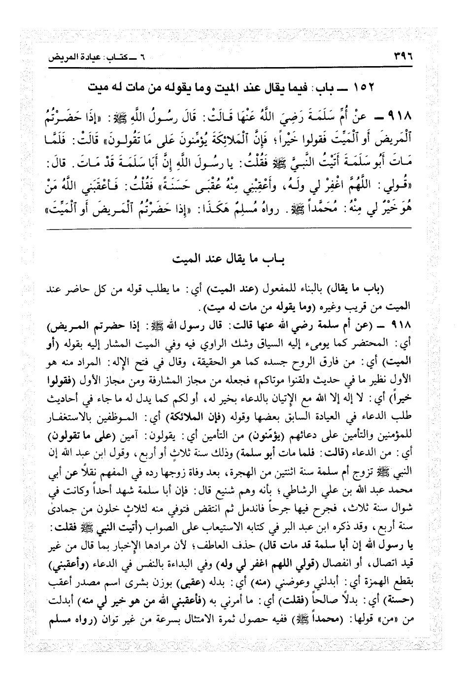 1920 - (عن أم سلمة رضي الله عنها قالت: قال رسول الله: إذا حضرتم المريض) أي المحتضر كما يومىء إليه السياق، وشك الراوي فيه وفي الميت المشار إليه بقوله (أو الميت) أي من فارق الروح جسده كما هو الحقيقة، وقال في «فتح الإله» : المراد منه هو الأول نظير ما في حديث «لقنوا موتاكم» فجعله من مجاز المشارفة» ومن مجاز الأول (فقولوا خيراً) أي لا إله إلا الله مع الإتيان بالدعاء بخير له أولكم كما يدل هل ما جاء في أحاديث طلب الدعاء في العيادة السابق بعضها، وقوله (فإن الملائكة) أي الموظفين بالاستغفار للمؤمنين وللتأمين على دعائهم (يؤمنون) من التأمين: أي يقولون آمين (على ما تقولون) أي من الدعاء (قالت: فلما مات أبو سلمة) وذلك سنة ثلاث أو أربع، وقول ابن عبد الله: إن النبي تزوّح أم سلمة سنة اثنتين من الهجرة بعد وفاة زوجها، رده في «المفهم» نقلاً عن أبي محمد عبد الله بن على الرشاطى بأنه وهم شنيع، قال: فإن أبا سلمة شهد أحداً وكانت في شوال سنة ثلاث فجرح فيها جرحاً فاندمل ثم انتقض فتوفي منه لثلاث خلون من جمادى سنة أربع، وقد ذكره ابن عبد البرّ في كتابه «الاستيعاب» على الصواب (أتيت النبي فقلت: يا رسول الله إن أبا سلمة قد مات، قال) حذف العاطف لأن مرادها الإخبار بما قال من غير قيد اتصال أو انفصال (قولي: اللهم اغفر لي وله) فيه البداءة بالنفس في الدعاء (وأعقبني) بقطع الهمزة: أي أبدلني وعوضني (منه) أي بدله (عقبى) بوزن بشرى اسم مصدر أعقب (حسنة) أي بدلاً صالحاً (فقلت) أي ما أمرني به (فأعقبني الله من هو خير لي منه) أبدلت «من» من قولها (محمداً) ففيه حصول ثمرة الامتثال بسرعة من غير توان (رواه مسلم