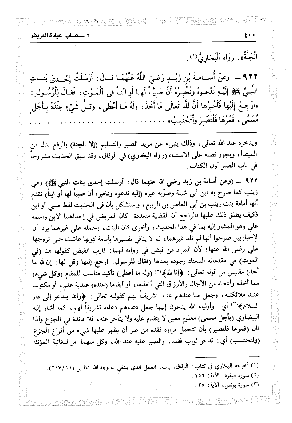5924 - (وعن أسامة بن زيد رضي الله عنهما قال: أرسلت إحدى بنات النبي) وهي زينب كما صرح به ابن أبي شيبة وصوبه غيره (إليه تدعوه وتخبره أن صبياً لها أو ابناً) تقدم أنها أمامة بنت زينب من أبي العاص بن الربيع واستشكل بأن في الحديث لفظ صبيّ أوابن فكيف يطلق ذلك عليها؟ فالراجح أن القضية متعددة كان المريض في إحداهما الابن واسمه عليّ وهو المشار إليه بما في هذا الحديث، وأخرى كان البنت، وحمله على غيرهما يرد بأن الإخباريين صرحوا أنها لم تلد غيرهما، ثم لا ينافي تفسيرها بأمامة كونها عاشت حتى تزوجها عليّ رضي الله عنه، لأن المراد من قبض في رواية لهما قارب القبض كقولها هنا (في الموت) في مقدماته المعتاد وجوده بعدها (فقال للرسول: ارجع إليها وقل لها: إن لله ما أخذ) مقتبس من قوله تعالى: {إنا لله} (البقرة: 156) (وله ما أعطى) تأكيد مناسب للمقام (وكل شيء) مما أخذه وأعطاه من الآجال والأرزاق التي أخذها وأبقاها (عنده) عندية علم أو مكتوب عند ملائكته وجعل ما عندهم عنده تشريفاً لهم كقوله تعالى: {والله يدعو إلى دار السلام} (يونس: 25) أي وأولياء الله يدعون إليها جعل دعاءهم دعاءه تشريفاً لهم كما أشار إليه البيضاوي (بأجل مسمى) معلوم معين لا يتقدم عليه ولا يتأخر عنه فلا فائدة في الجزع، ولذا قال (فمرها فتصبر) بأن تتحمل مرارة فقده من غير أن يظهر عليها شيء من أنواع الجزع (ولتحتسب) أي تدخر ثواب فقده والصبر عليه عند الله، وكل منهما أمر للغائبة المؤنثة