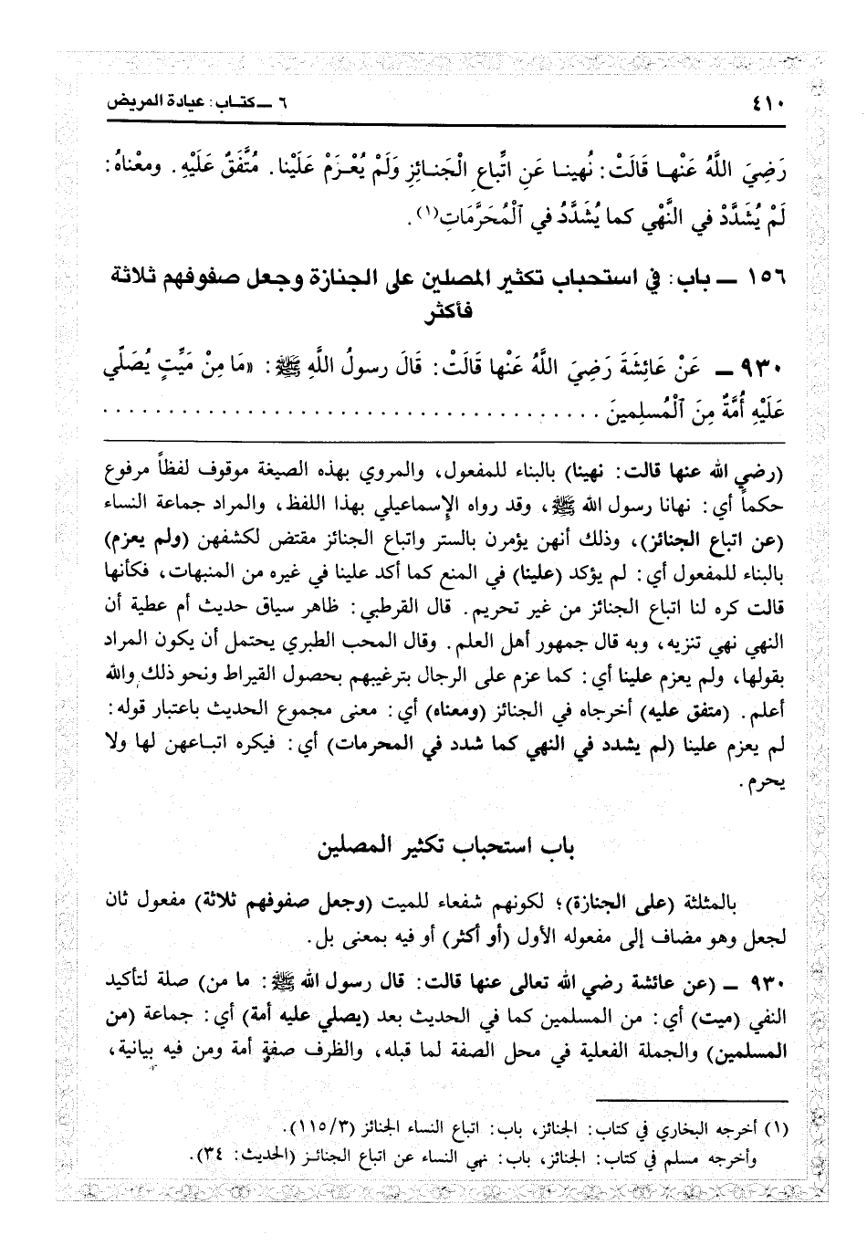 (رضي الله عنه قالت: نهينا) بالبناء للمفعول، والمروي بهذه الصيغة موقوف لفظاً مرفوع حكماً: أي نهانا رسول الله، وقد رواه الإسماعيلي بهذا اللفظ والمراد جماعة النساء (عن اتباع الجنائز) وذلك أنهن يؤمرن بالستر واتباع الجنائز مقتض لكشفهن (ولم يعزم) بالبناء للمفعول: أي لم يؤكد (علينا) في المنع كما أكد علينا في غيره من المنهيات فكأنها قالت: كره لنا اتباع الجنائز من غير تحريم. قال القرطبي: ظاهر سياق حديث أم عطية أن النهي نهى تنزيه وبه قال جمهور أهل العلم. وقال المحب الطبري: يحتمل أن يكون المراد بقولها ولم يعزم علينا: أي كما عزم على الرجال بترغيبهم بحصول القيراط ونحو ذلك والله أعلم (متفق عليه) أخرجاه في الجنائز (ومعناه) أي معنى مجموع الحديث باعتبار قوله «لم يعزم علينا» (ولم يشدد في النهي كما يشدد في المحرمات) أي فيكره اتباعهن لها ولا يحرم.
