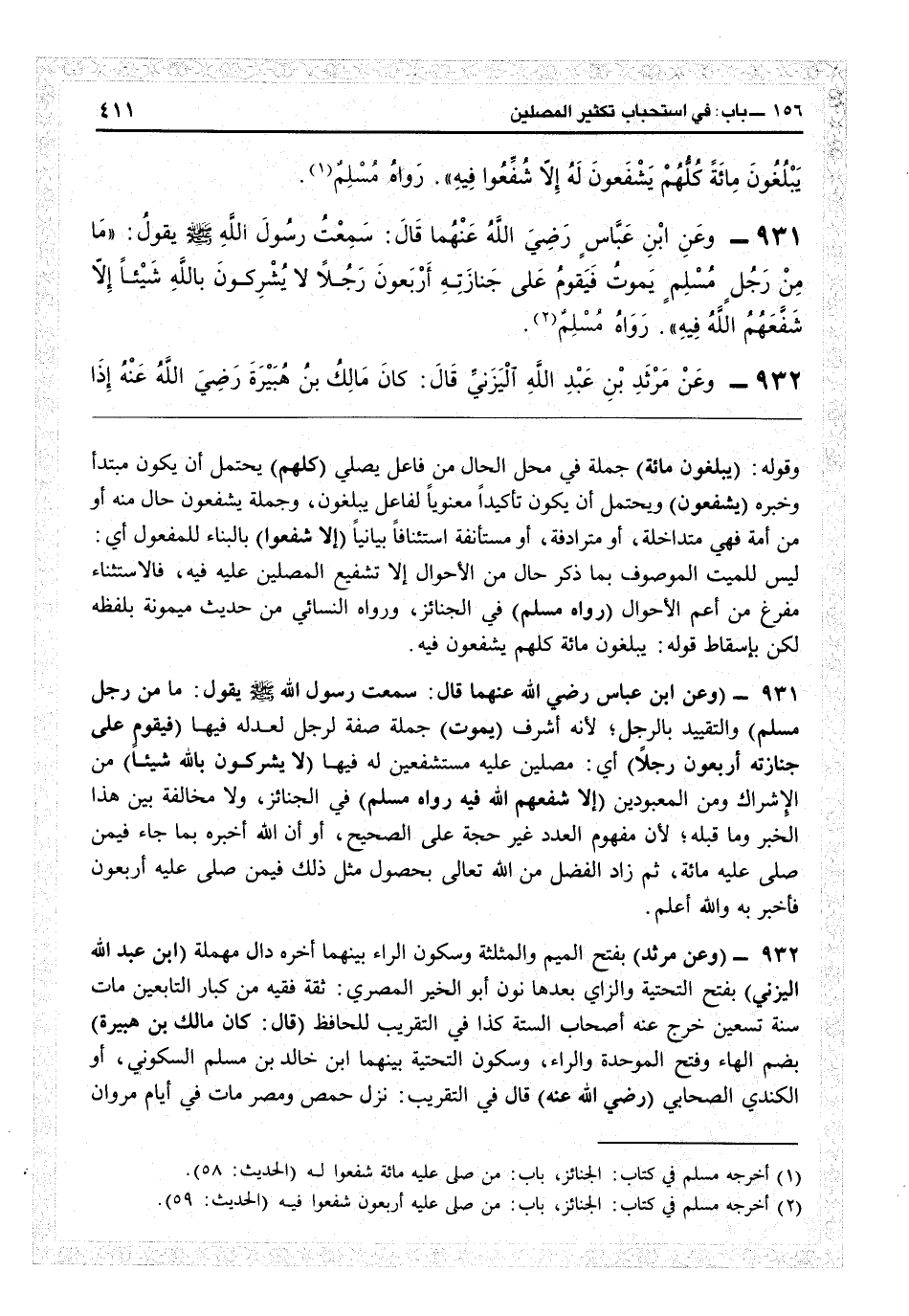وقوله (يبلغون مائة) جملة في محل الحال من فاعل يصلي (كلهم) يحتمل أن يكون مبتدأ وخبره «يشفعون» ويحتمل أن يكون تأكيداً معنوياً لفاعل يبلغون، وجملة يشفعون حال منه أو من أمة فهي متداخلة أو مترادفة أو مستأنفة استئنافاً بيانياً (إلا شفعوا) بالبناء للمفعول: أي من أعم الأحوال (رواه مسلم) في الجنائز، ورواه النسائي من حديث ميمونة بلفظه، لكن بإسقاط قوله «يبلغون مائة كلهم يشفعون فيه» .