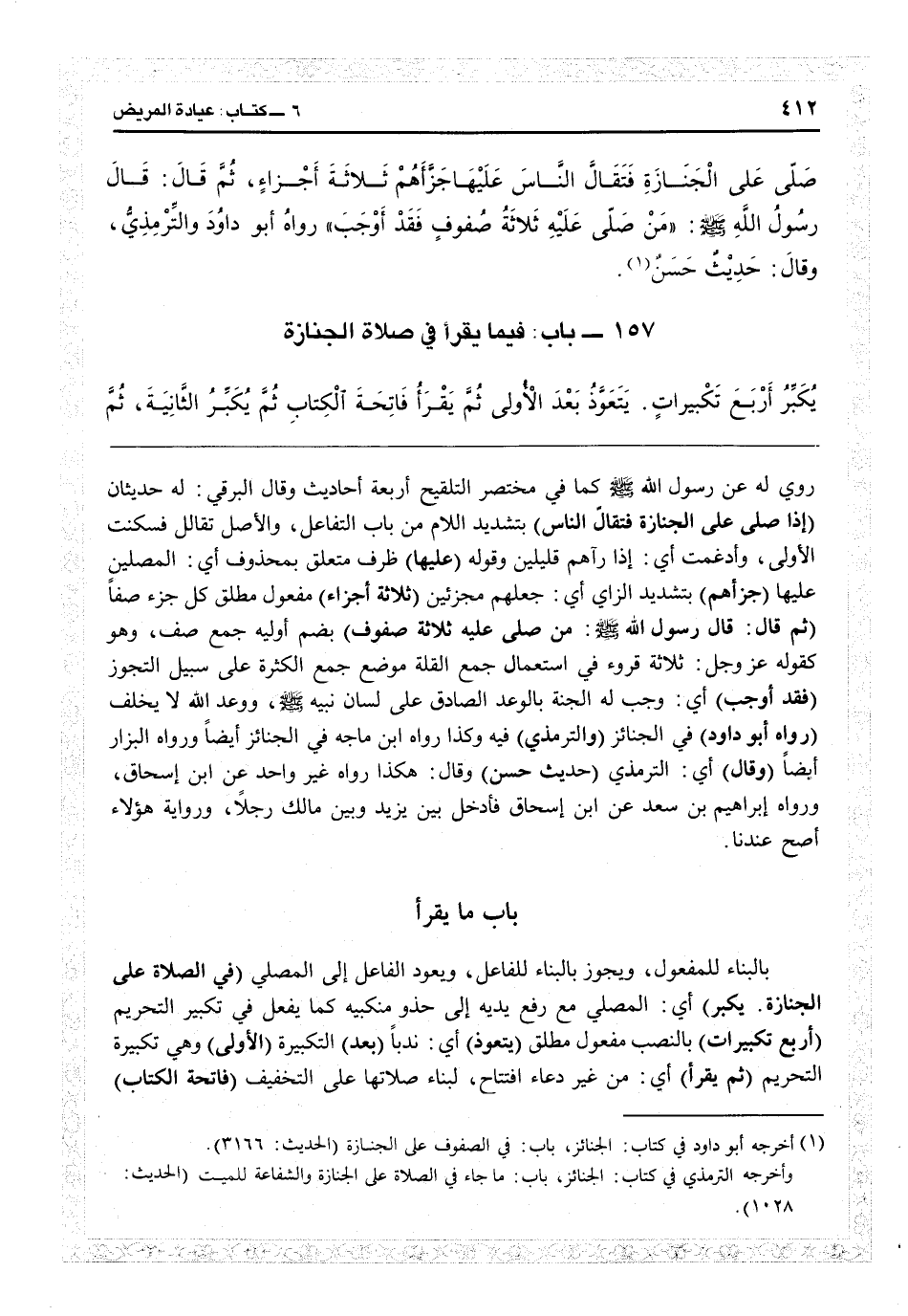 بالبناء للمفعول ويجوز بالبناء للفاعل ويعود الفاعل إلى المصلي (في الصلاة على الجنازة) . (يكبر) أي المصلي مع رفع يديه إلى حذو منكبيه كما يفعل في تكبير التحريم (أربع تكبيرات) بالنصب مفعول مطلق (يتعوذ) أي ندباً (بعد) التكبيرة (الأولى) وهي تكبيرة التحريم (ثم يقرأ) أي من غير دعاء افتتاح صلاتها على التخفيف (فاتحة الكتاب)