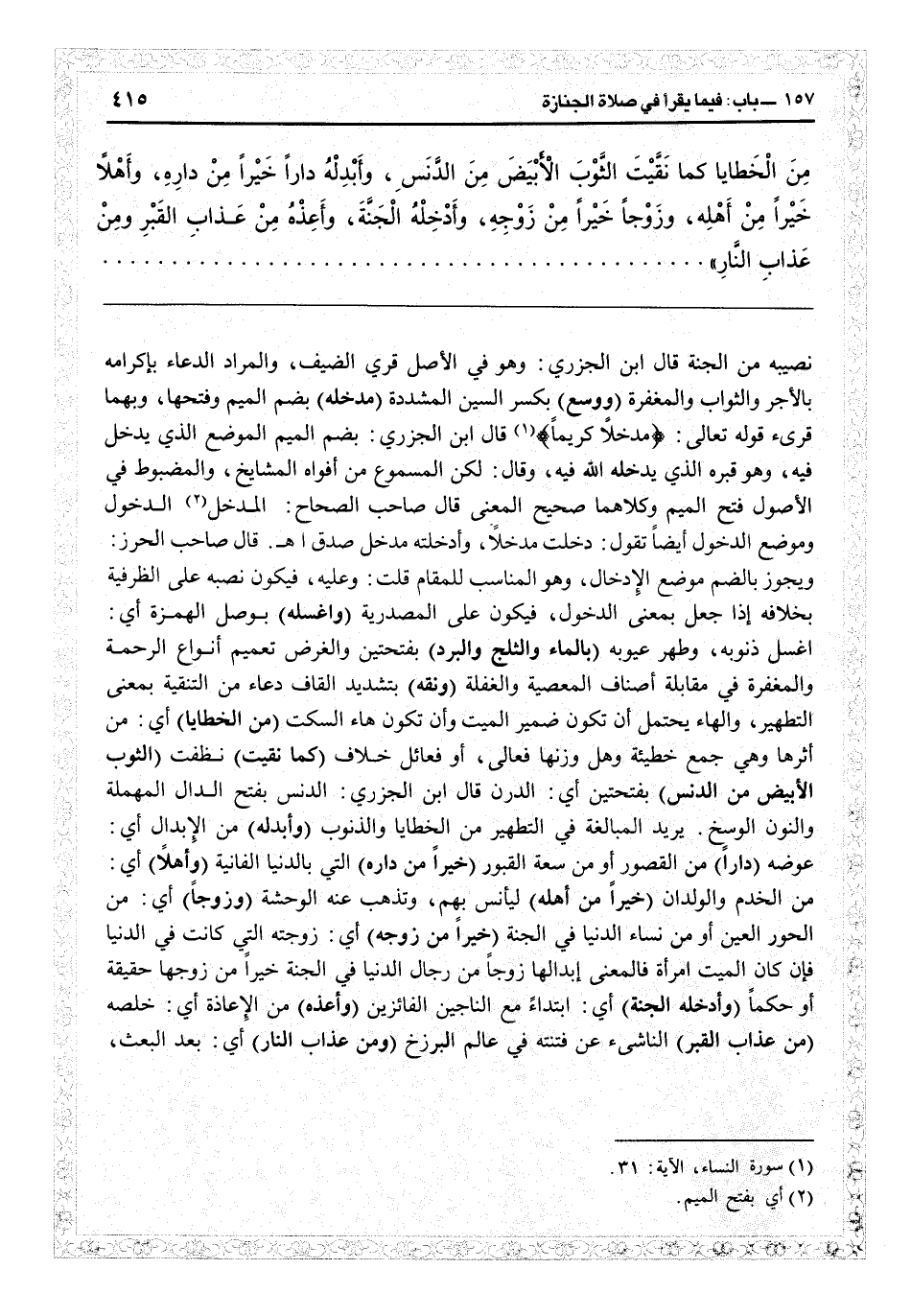 نصيبه من الجنة. قال ابن الجزري: وهو في الأصل قرى الضيف، والمراد الدعاء بإكرامه بالأجر والثواب والمغفرة (ووسع) بكسر السين المشددة (مدخله) بضم الميم وفتحها وبهما قرى قوله تعالى: {مدخلاً كريماً} (النساء: 31) قال ابن الجزري: بضم الميم الموضع الذي يدخل فيه وهو قره الذي يدخله الله فيه، وقال: لكن المسموع من أفواه المشايخ والمضبوط في الأصول فتح الميم وكلاهما صحيح المعنى. قال صاحب «الصحاح» : المدخل الدخول وموضع الدخول أيضاً تقول دخلت مدخلاً وأدخلته مدخل صدق اهـ. قال صاحب «الحرز» : ويجوز بالضم موضع الإدخال وهو المناسب للمقام. قلت: وعليه فيكون نصبه على الظرفية بخلافه إذا جعل بمعنى الدخول فيكون على المصدرية (واغسله) بوصل الهمزة: أي اغسل ذنوبه وطهر عيوبه (بالماء والثلج والبرد) بفتحتين، والغرض تعميم أنواع الرحمة والمغفرة في مقابلة أصناف المعصية والغفلة (ونقه) بتشديد القاف دعاء من التنقية، بمعنى التطهير، والهاء يحتمل أن تكون ضمير الميت وأن تكون هاء السكت (من الخطايا) أي من أثرها وهي جمع خطيئة وهل وزنها