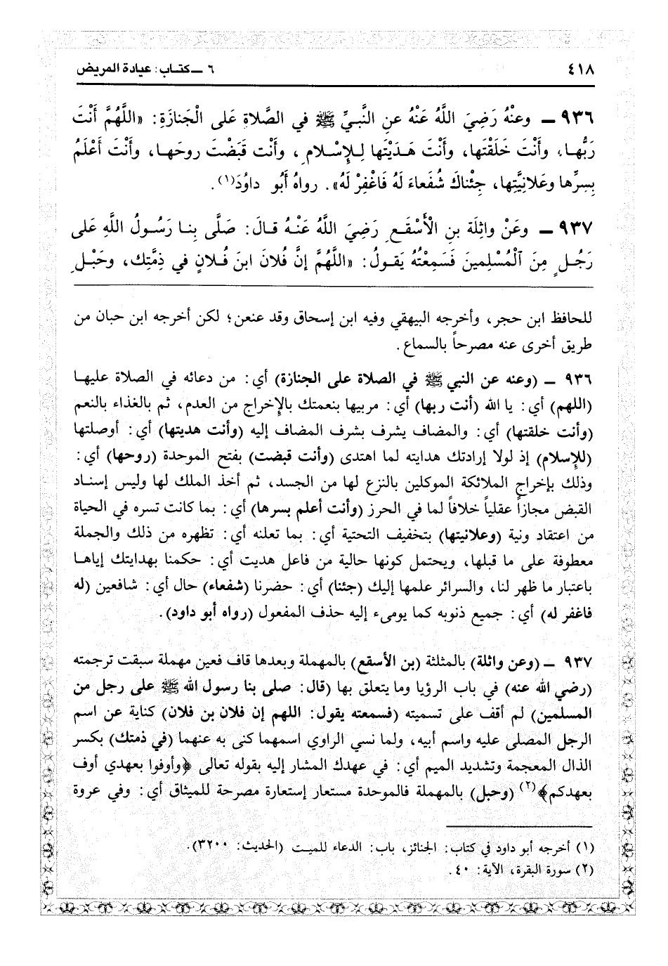 4938 - (وعنه عن النبي في الصلاة على الجنازة) أي من دعائه في الصلاة عليها (اللهم) أي يا ألله (أنت ربها) أي مربيها بنعمتك بالإخراج من العدم ثم بالغذاء بالنعم (وأنت خلقتها) أي والمضاف يشرف بشرف المضاف إليه (وأنت هديتها) أي أوصلتها (للإسلام) إذ لولا إرادتك هدايته لما اهتدى (وأنت قبضت) بفتح الموحدة (روحها) أي وذلك بإخراج الملائكة الموكلين بالنزع لها من الجسد ثم أخذ الملك لها. وليس إسناد القبض مجازاً عقلياً خلافاً لما في «الحرز» (وأنت أعلم بسرها) أي بما كانت تسره في الحياة من اعتقاد ونية (وعلانيتها) بتخفيف التحتية: أي ما تعلنه أي تظهره من ذلك والجملة معطوفة على ما قبلها ويحتمل كونها حالية من فاعل هديت: أي حكمنا بهدايتك إياها باعتبار ما ظهر لنا والسرائر علمها إليك (جئنا) أي حضرنا (شفعاء) حال أي شافعين (له فاغفر له) أي جميع ذنوبه كما يومىء إليه حذف المفعول (رواه أبو داود) .