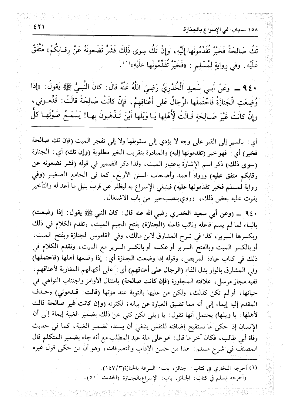 أي بالسير إلى القبر على وجه لا يؤدي إلى سقوطها ولا إلى تفجر الميت (فإن تك صالحة فخير) أي فهو خير (تقدمونها إليه) والمبادرة بتقريب الخير مطلوبة (وإن تك) أي الجنازة (سوى ذلك) ذكر اسم الإشارة باعتبار الميت ولذا ذكر الضمير في قوله (فشر تضعونه عن رقابكم، متفق عليه) ورواه أحمد وأصحاب السنن الأربع كما في «الجامع الصغير» (وفي رواية لمسلم: فخير تقدمونها عليه) فينبغي الاسراع به ليظفر عن قرب بنيل ماأعد له والتأخير يفوِّت عليه بعض ذلك، وروى بنصب خير من باب الاشتغال.