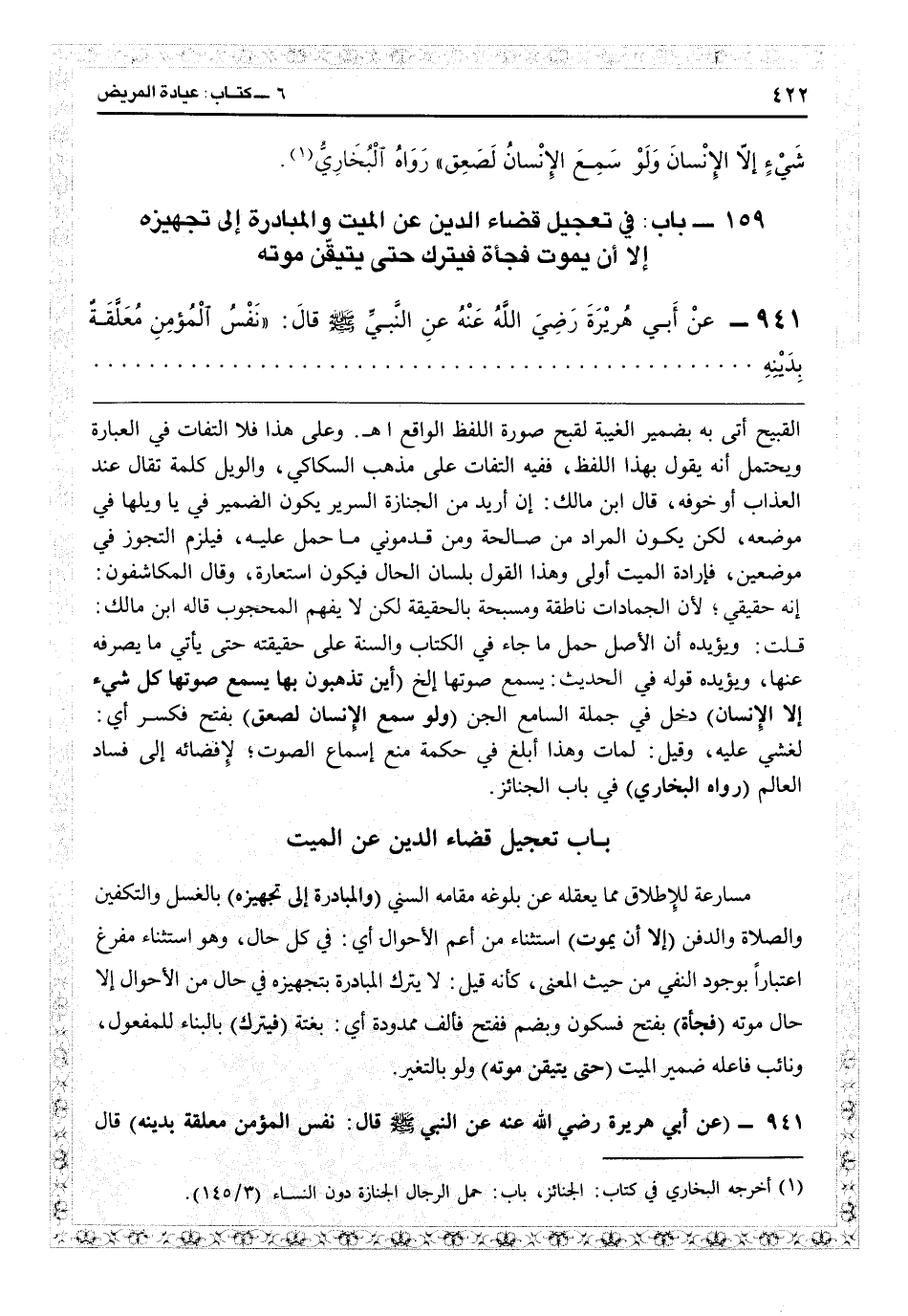 1943 - (عن أبي هريرة رضي الله عنه عن النبيّ قال: نفس المؤمن معلقة بدينه) قال