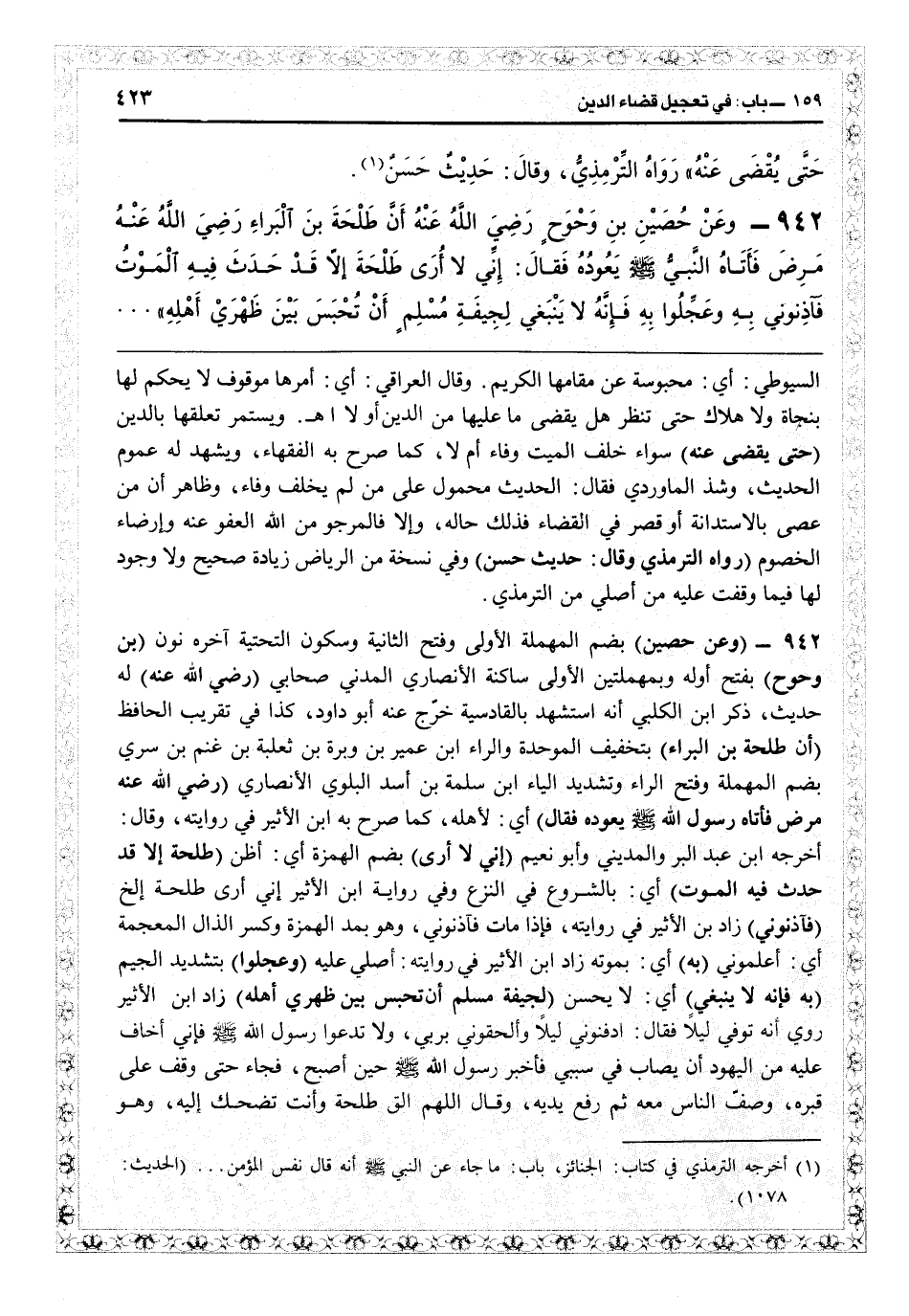 السيوطي: أي محبوسة عن مقامها الكريم. وقال العراقي: أي أمرها موقوف لا يحكم لها بنجاة ولا هلاك حتى تنظر: هل يقضي ما عليها من الدين أو لا؟ ويستمر تعلقها الحديث. وشذ الماوردي فقال: الحديث محمول على من لم يخلف وفاء، وظاهر أن من عصى بالاستدانة أو قصر في القضاء فذلك حاله، وإلا فالمرجو من الله العفو عنه وإرضاء الخصوم (رواه الترمذي وقال: حديث حسن) وفي نسخة من الرياض زيادة «صحيح» ولا وجود لها فيما وقفت عليه من أصلي من الترمذي.