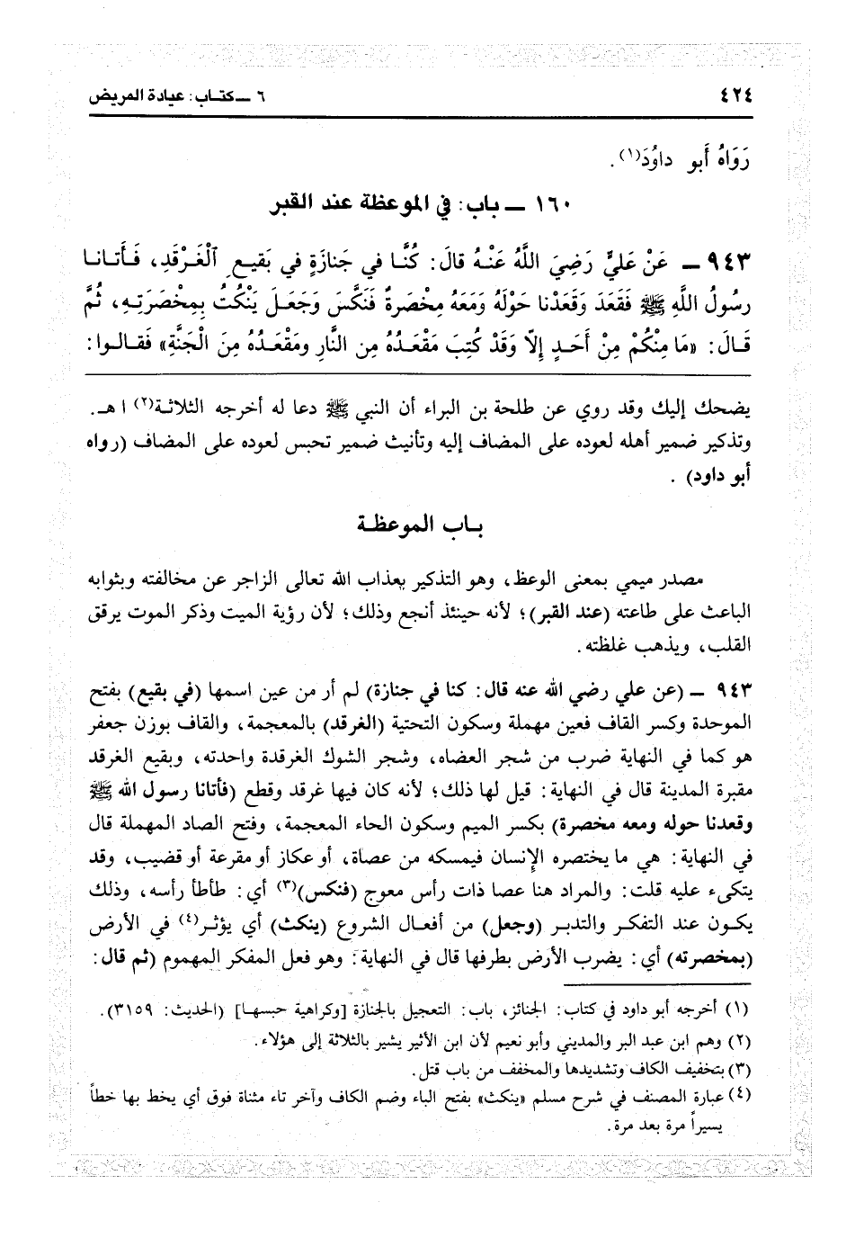 3945 - (عن علي رضي الله عنه قال: كنا في جنازة) لم أر عين اسمها (في بقيع) بفتح الموحدة وكسر القاف فعين مهملة وسكون التحتية (الغرقد) بالمعجمة والقاف بوزن جعفر هو كما في «النهاية» : ضرب من شجر العضاه وسجر الشوك، الغرقدة واحدته، وبقيع الغرقد: مقبرة المدينة، قال في «النهاية» : قيل لها ذلك لأنه كان فيها غرقد وقطع (فأتانا رسول الله فقعد وقعدنا حوله ومعه مخصرة) بكسر الميم وسكون الخاء المعجمة وفتح الصاد المهملة، قال في النهاية: هي ما يختصره الإنسان فيمسكه: من عصاة أو عكاز أو مقرعة أو قضيب، وقد يتكىء عليه. قلت: والمراد هنا عصا ذات رأس معوج (فنكس) أي طأطأ رأسه، وذلك يكون عند التفكر والتدبر (وجعل) من أفعال الشروع (ينكث) أي يؤثر في الأرض (بمخصرته) أي يضرب الأرض بطرفها، قال في «النهاية» : وهو فعل المفكر المهموم (ثم قال: