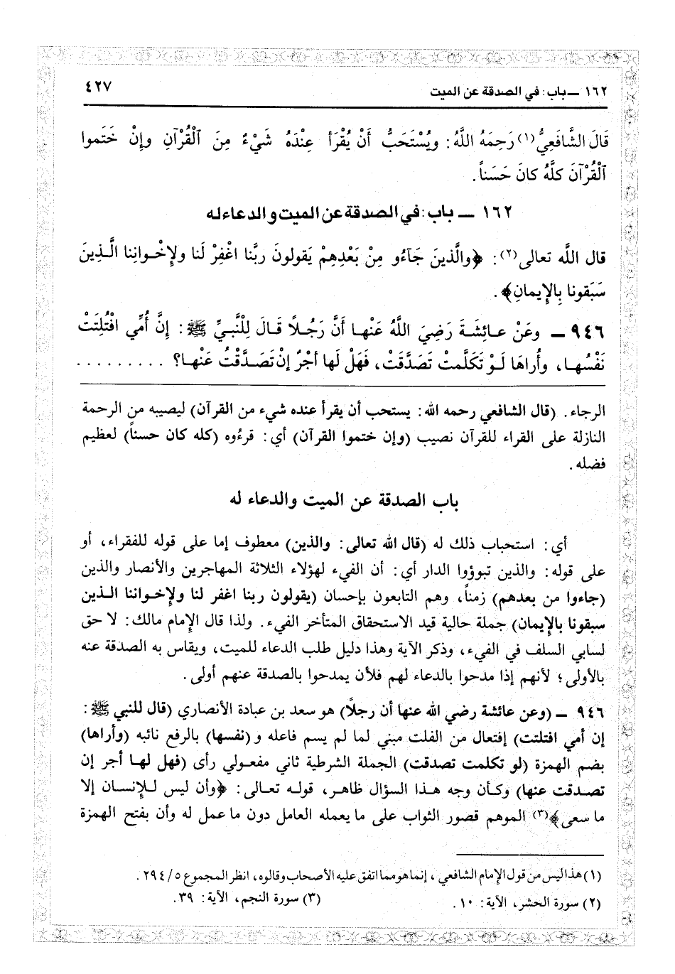 1 948ـ (وعن عائشة رضي الله عنها أن رجلاً) هو سعد بن عبادة الأنصاري (قال للنبي: إن أمى افتلتت) افتعال من الفلت مبني لما لم يسم فاعله و (نفسها) بالرفع نائبه (وأراها) بضم الهمزة (لو تكلمت تصدقت) الجملة الشرطية ثاني مفعولي رأى (فهل لها أجر إن تصدقت عنها؟) وكأن وجه هذا السؤال ظاهر قوله تعالى: {وأن ليس للإنسان إلا ما سعى} (النجم: 39) الموهم قصور الثواب على ما يعمله العامل دون ما عمل له وإن بفتح الهمزة