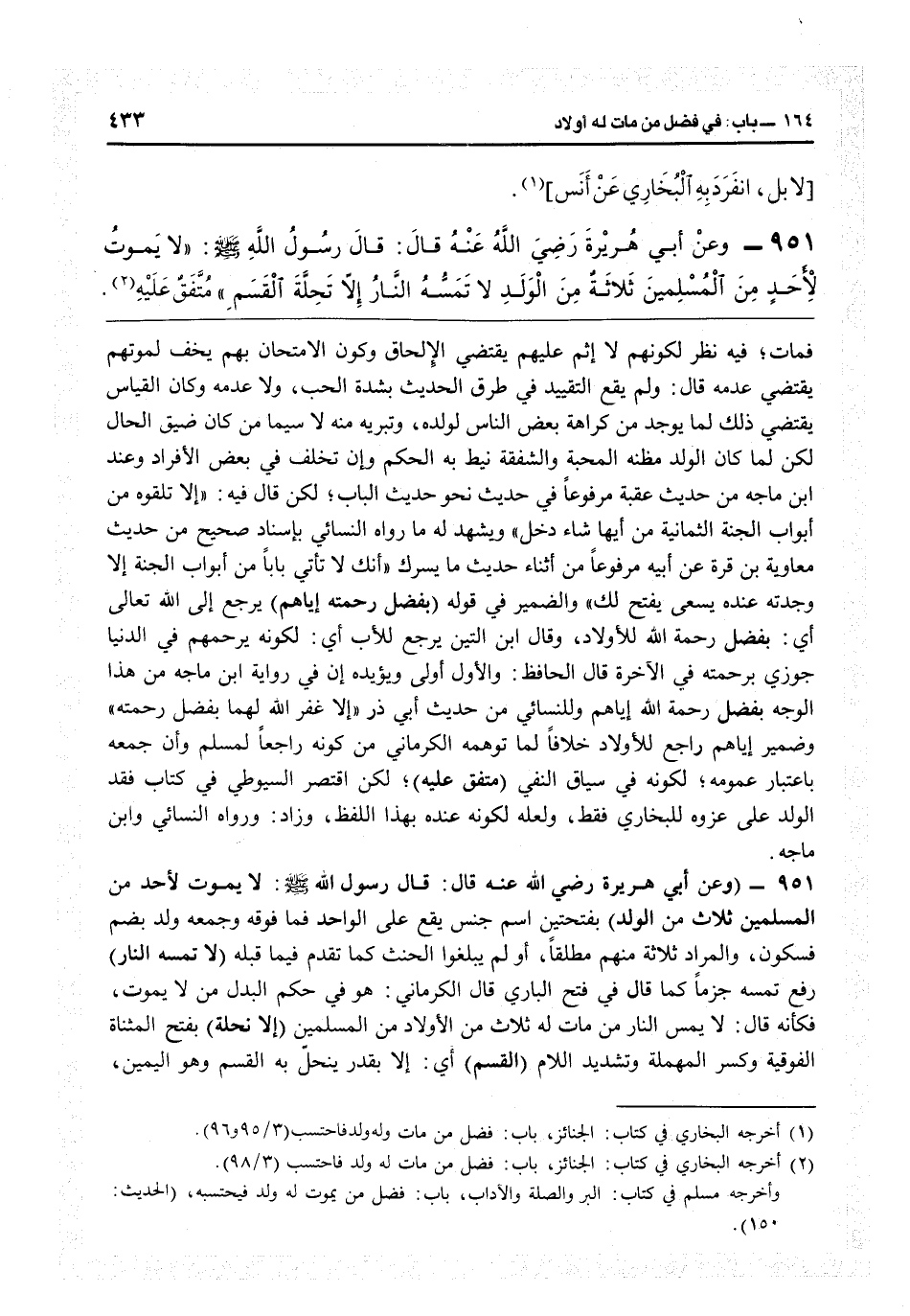 فمات؛ فيه نظر لكونهم لا إثم عليهم يقتضي الإلحاق، وكون الامتحان بهم يخفّ لموتهم يقتضي عدمه، قال: ولم يقع التقييد في طرق الحديث بشدة الحبّ ولا عدمه، وكان القياس يقتضي ذلك لما يوجد من كراهة بعض الناس لولده وتبريه منه لاسيما من كان ضيق الحال، لكن لما كان الولد مظنة المحبة والشفقة نيط الحكم به وإن تخلف في بعض الأفراد. وعند أبي ماجه من حديث عقبة مرفوعاً حديث نحو حديث الباب لكن قال فيه «إلا تلقوه من أبواب الجنة الثمانية من أيها شاء دخل» ويشهد له رواه النسائي بإسناد صحيح من حديث معاوية بن قرة عن أبيه مرفوعاً من أثناء حديث «أما يسرك أنك لا تأتي باباً من أبواب الجنة إلا وجدته عنده يسعى يفتح لك؟» والضمير في قوله «بفضل رحمته إياهم» يرجع إلى الله تعالى: أي بفضل رحمة الله للأولاد، وقال ابن التين: يرجع للأب: أي لكونه يرحمهم في الدنيا جوزى برحمته في الآخرة. قال الحافظ: والأولى أولى، ويؤيده أن في رواية ابن ماجه من هذا الوجه بفضل رحمة الله إياهم. وللنسائي من حديث أبي ذرّ «إلا غفر الله لهما بفضل رحمته» وضمير إياهم راجع للأولاد خلافاً لما توهمه الكرماني من كونه راجعاً لمسلم وإن جمعه باعتبر عمومه لكونه في سياق النفي (متفق عليه) لكن اقتصر السيوطي في كتاب فقد الولد على عزوه للبخاري فقط، ولعله لكونه عنده بهنا اللفظ، وزاد: ورواه النسائي وابن ماجه.