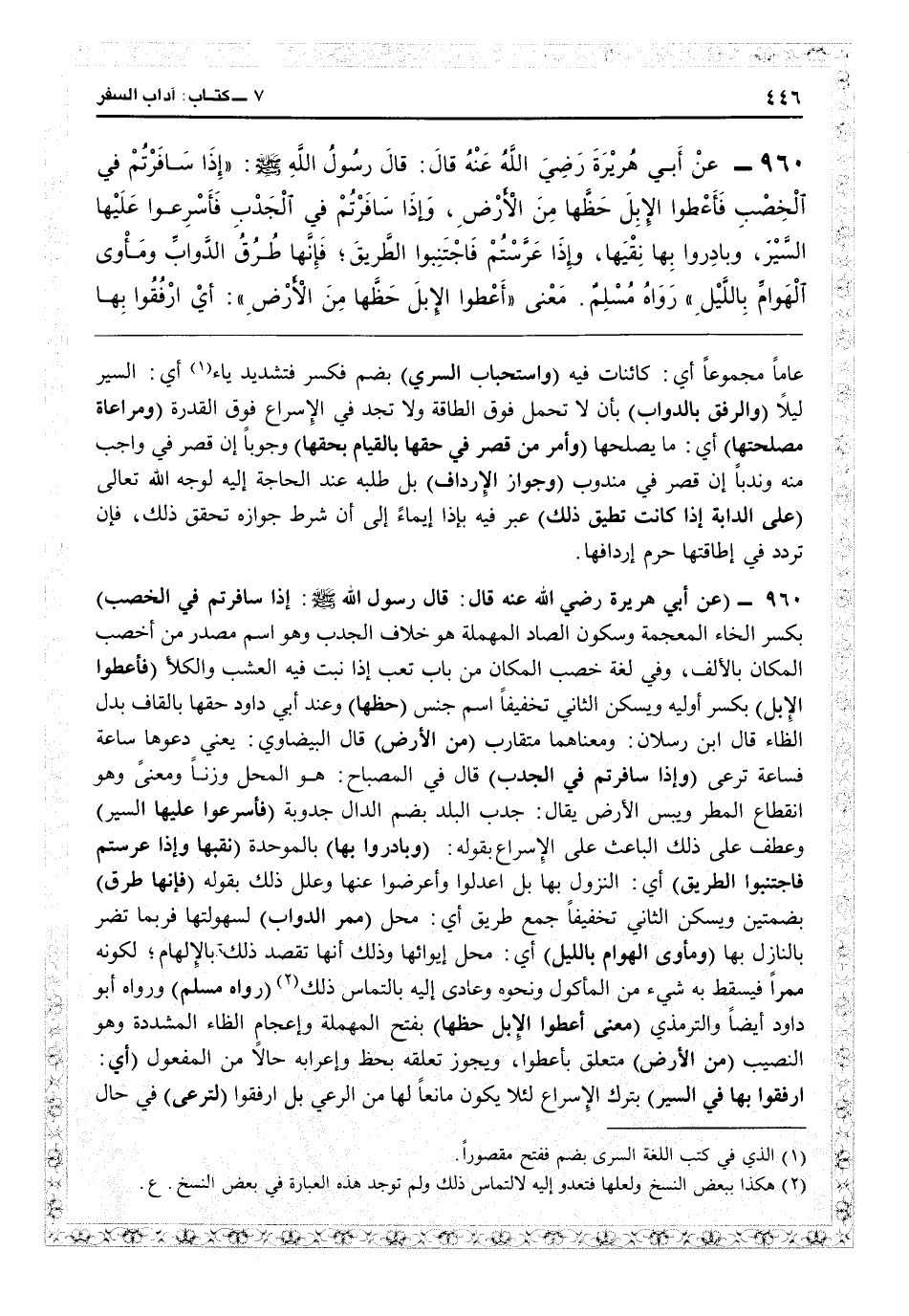 عاماً مجموعاً: أي كاثنات فيه (واستحباب السري) بضم فكسر فتشديد ياء: أي السير ليلاً (والرفق بالدواب) بأن لا تحمل فوق الطاقة ولا تجدّ في الإسراع فوق القدرة (ومراعاة مصلحتها) أي ما يصلحها (وأمر من قصر في حقها بالقيام بحقها) وجوباً إن قصر في واجب منه وندباً إن قصر في مندوب (وجواز الإرداف) بل طلبه عند الحاجة إليه لوجه الله تعالى (على الدارة إذا كانت تطيق ذلك) عبَّر فيه بإذا إيماء إلى أن شرط جوازه تحقق ذلك، فإن تردد في إطاقتها حرم إردافها.
