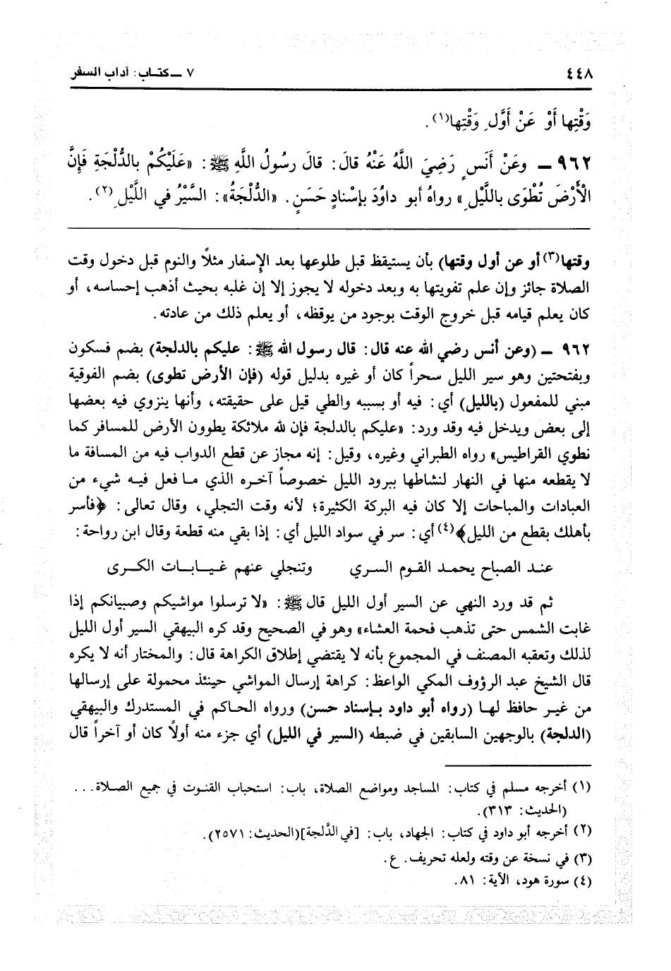 ثم قد ورد النهي عن السير أول الليل، قال «لا ترسلوا مواشيكم وصبيانكم إذا غابت الشمس حتى تذهب فحمة العشاء» وهو في الصحيح، وقد كره البيهقي السير أول الليل لذلك، وتعقبه المصنف في المجموع بأنه لا يقتضي إطلاق الكراهة قال: والمختار أنه لا يكره، قال الشيخ عبد الرءوف المكي الواعظ: كراهة إرسال المواشي حينئذ محمولة على إرسالها من غير حافظ لها (رواه أبو داود بإسناد حسن) ورواه الحاكم في «المستدرك» والبيهقي (الدلجة) بالوجهين السابقين في ضبطه (السير في الليل) أي جزء منه أولاً كان أو آخراً.