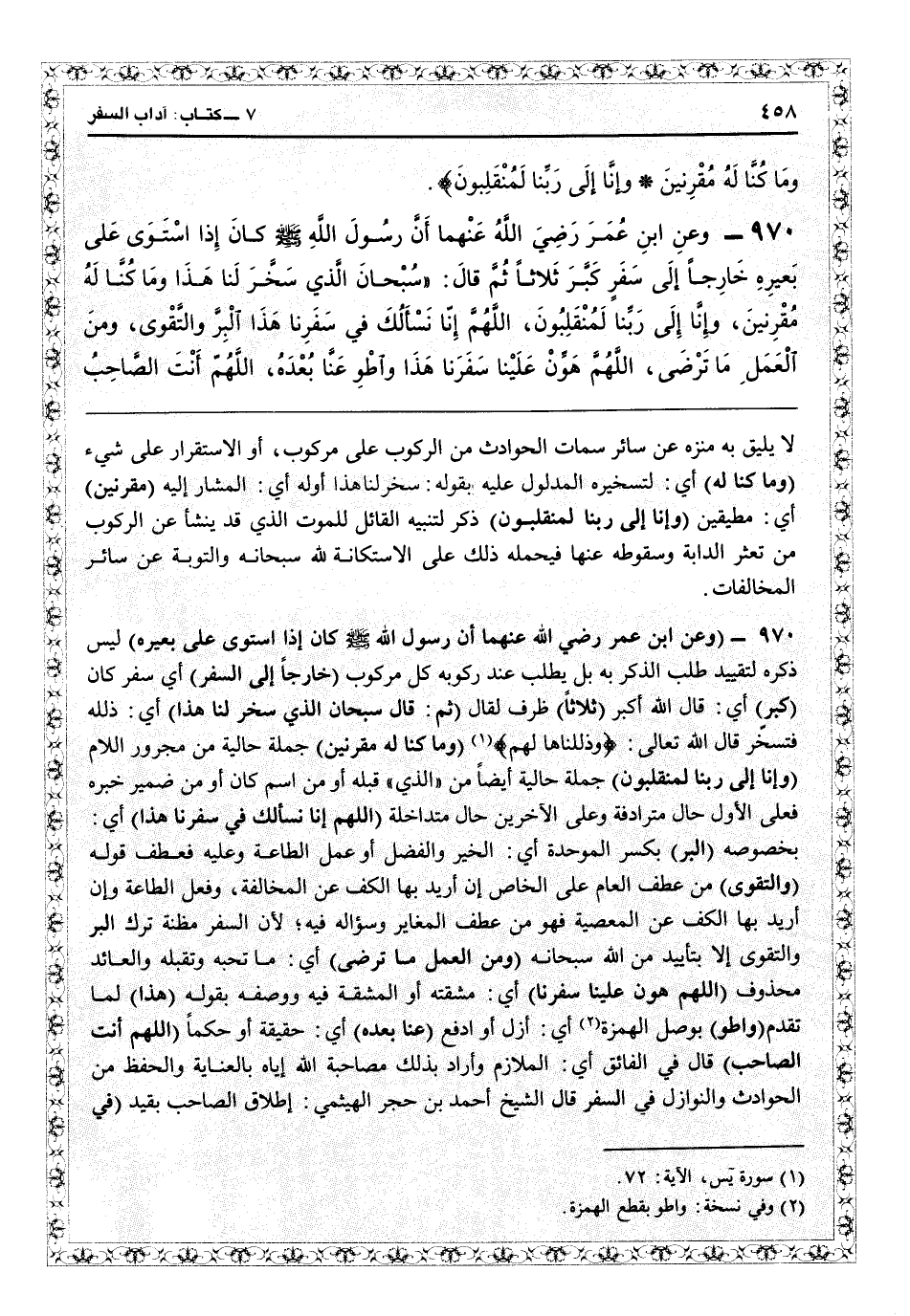 1972 - (وعن ابن عمر رضي الله عنهما: أن رسول الله كان إذا استوى على بعيره) ليس ذكره لتقييد طلب الذكر به بل يطلب عند ركوبه كل مركوب (خارجاً إلى السفر) أي سفر كان (كبر) أي قال الله أكبر (ثلاثاً) ظرف لكبر ( {ثم قال: سبحان الذي سخر لنا هذا} ) أي ذلله فتسخر قال الله تعالى: {وذللناها لهم} (يس: 72) ( {وما كنا له مقرنين} ) جملة حالية من مجرور واللام ( {وإنا إلى ربنا لمنقلبون} ) جملة حالية أيضاً من «الذي» قبله أو من اسم كان أو ضمير خبره، فعلى الأول حال مترادفة وعلى الآخر حال متداخلة (اللهم إنا نسألك في سفرنا هذا) أي بخصوصه (البر) بكسر الموحدة أي الخير والفضل أو عمل الطاعة وعليه فعطف قوله (والتقوى) من عطف العام على الخاص إن أريد بها الكف عن المخالفة وفعل الطاعة، وإن أريد بها الكفّ عن المعصية فهو من عطف المغاير وسؤال ذلك فيه لأن السفر مظنة ترك البرّ والتقوى إلا بتأييد من الله سبحانه (ومن العمل ما ترضى) أي ما تحبه وتقبله والعائد محذوف (اللهم هون علينا سفرنا) أي مشقته أو المشقة فيه ووصفه بقوله (هذا) لما تقدم (واطو) بوصل الهمزة: أي أزل أو ادفع (عنا بعده) أي حقيقة أو حكماً (اللهم أنت الصاحب) قال في «الفائق» : أي الملازم، وأراد بذلك مصاحبة الله إياه بالعناية والحفظ من الحوادث والنوازل في السفر.t قال الشيخ أحمد بن حجر الهيتمي: إطلاق الصاحب على الله تعالى بقيد (في
