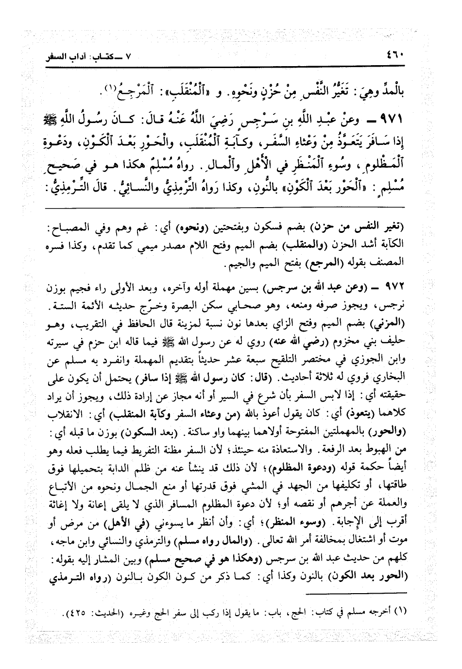 2973 - (وعن عبد الله بن سرجس) بسين مهملة أوله وآخره وبعد الأولى راء فجيم بوزن نرجس ويحرز صرفه ومنعه، وهو صحابي سكن البصرة وخرج حديثه الأئمة الستة (المزني) بضم الميم وفتح الزاي بعدها نون نسبة لمزينة، قال الحافظ في «التقريب» : وهو حليف بني مخزوم (رضي الله عنه) روي له عن رسول الله فيما قاله ابن حزم في سيرته وابن الجوزي في «مختصر التلقيح» سبعة عشر حديثاً بتقديم المهملة، وانفرد به مسلم عن البخاري فروى له ثلاثة أحاديث (قال كان رسول الله إذا سافر) يحتمل أن يكون على حقيقته: أي إذا لابس السفر بأن شرع في السير أو أنه مجاز عن إرادة ذلك، ويجوز أن يراد كلاهما (يتعوذ) أي كان يقول أعوذ بالله (من وعثاء السفر وكآبة المنقلب) أي الانقلاب (والحور) بالمهملتين المفتوحة أولاهما بينهما واو ساكنة (بعد الكون) بوزن ما قبله أي من الهبوط بعد الرفعة والاستعاذة منه حينئذ لأن السفر مظنة التفريط فيما يطلب فعله، وهو أيضاً حكمة قوله (ودعوة المظلوم) لأن ذلك قد ينشأ عنه من ظلم الدابة بتحميلها فوق طاقتها أو تكليفها من الجهد في المشي فوق قدرتها أو منع الجمال ونحوه من الإتباع والعملة عن أجرهم أو نقصه، أو لأن دعوة المظلوم المسافر الذي لا يلقي إعانة ولا إغاثة أقرب إلى الإجابة (وسوء المنظر) أي وأن أنظر ما يسوءني (في الأهل) من مرض أو موت أو اشتغال بمخالفة أمر الله تعالى (والمال رواه مسلم) والترمذي والنسائي وابن ماجه كلهم من حديث عبد الله بن سرجس (هكذا هو في صحيح مسلم) وبين المشار إليه بقوله (الحور بعد الكون) بالنون وكذا: أي كما ذكر من كون الكون بالنون (رواه الترمذي