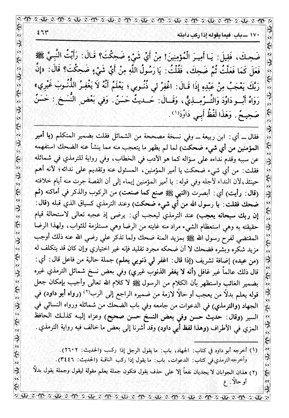 «فقال: أي ابن ربيعة، وفي نسخة مصححه من «الشمائل» «فقلت» بضمير المتكلم (يا أمير المؤمنين من أي شيء ضحكت) لما لم يظهر ما يتعجب منه مما ينشأ عنه الضحك استفهمه عن سببه وقدم نداءه على سؤاله كما هو الأدب في الخطاب، وفي رواية للترمذي في «شمائله» «فقلت من أي شيء ضحكت يا أمير المؤمنين» وتقديم المسؤول عنه على ندائه لأنه أهم حينئذ لأن النداء لأجله، وفي قوله يا أمير المؤمنين إيماء إلى أن القصة جرت منه أيام خلافته (قال: رأيت) أي أبصرت (النبي صنع كما صنعت) من الركوب والذكر في أماكنه (ثم ضحك فقلت: يا رسول الله من أي شيء ضحكت) وعند الترمذي كسياق الذي قبله (قال: إن ربك سبحانه يعجب) عند الترمذي «ليعجب» : أي يرضى إذ العجب المضاف في كلام الشارع إليه تعالى لاستحالة قيام حقيقته به وهي استعظام الشيء مع خفاء سببه به تعالى، مراد مه غايته من الرضا وهي مستلزمة للثواب. ولهذا الرضا المقتضى لفرح رسول الله إذ فيه مزيد المنة عليه ضحك، ولما تذكر عليّ رضي الله عنه ذلك أوجب مزيد شكره فبشره فضحك، لا أن ضحكه مجرد تقليد فإنه غير اختياري وإن كان قد يتكلف له (من عبده) إضافة تشريف (إذا قال رب اغفر لي ذنوبي يعلم) جملة حالية من فاعل قال: أي قال ذلك عالماً غير غافل (أنه لا يغفر الذنوب غيري) في بعض نسخ