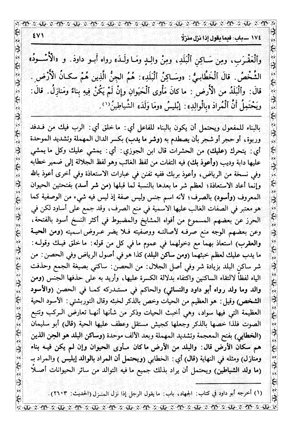 الحصن ساكني بصيغة الجمع وحذفت الباء لفظاً لالتقاء الساكنين واكتفاء بدلالة الكسرة عليها وأريد به على حذفها الجنس (ومن والد وما ولد، رواه أبو داود والنسائي) والحاكم في «مستدركه» كما في الحصن (والأسود الشخص) وقيل هو العظيم من الحيات وخص بالذكر لخبثه، وقال التوربشتي: الأسود الحية العظيمة التي فيها سواد وهي أخبث الحيات، وذكر من شأنها أنها تعارض الركب وتتبع الصوت فلذا خصها بالذكر، وجعلها كجنس مستقل وعطف عليها الحية (قال) أبو سليمان (الخطابي) بفتح المعجمة وتشديد الهاء المهملة وبعد الألف موحدة (وساكن البلد: هو الجن الذين هم سكان الأرض، قال والبلد من الأرض ما كان مأوى الحيوان وإن لم يكن فيه بناء ومنازل) . ومثله في «النهاية» (قال) أي الخطابي (ويحتمل أن المراد بالولد إبليس و) المراد بِـ (ما ولد الشياطين) ويحتمل أن يراد بذلك جميع ما فيه التوالد من سائر الحيوانات أصلاً