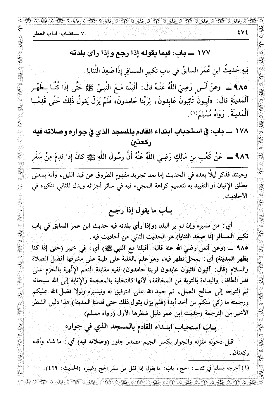 177 - باب ما يقول إذا رجع أي من مسيره وإن لم ير البلد وإذا رأى بلدته