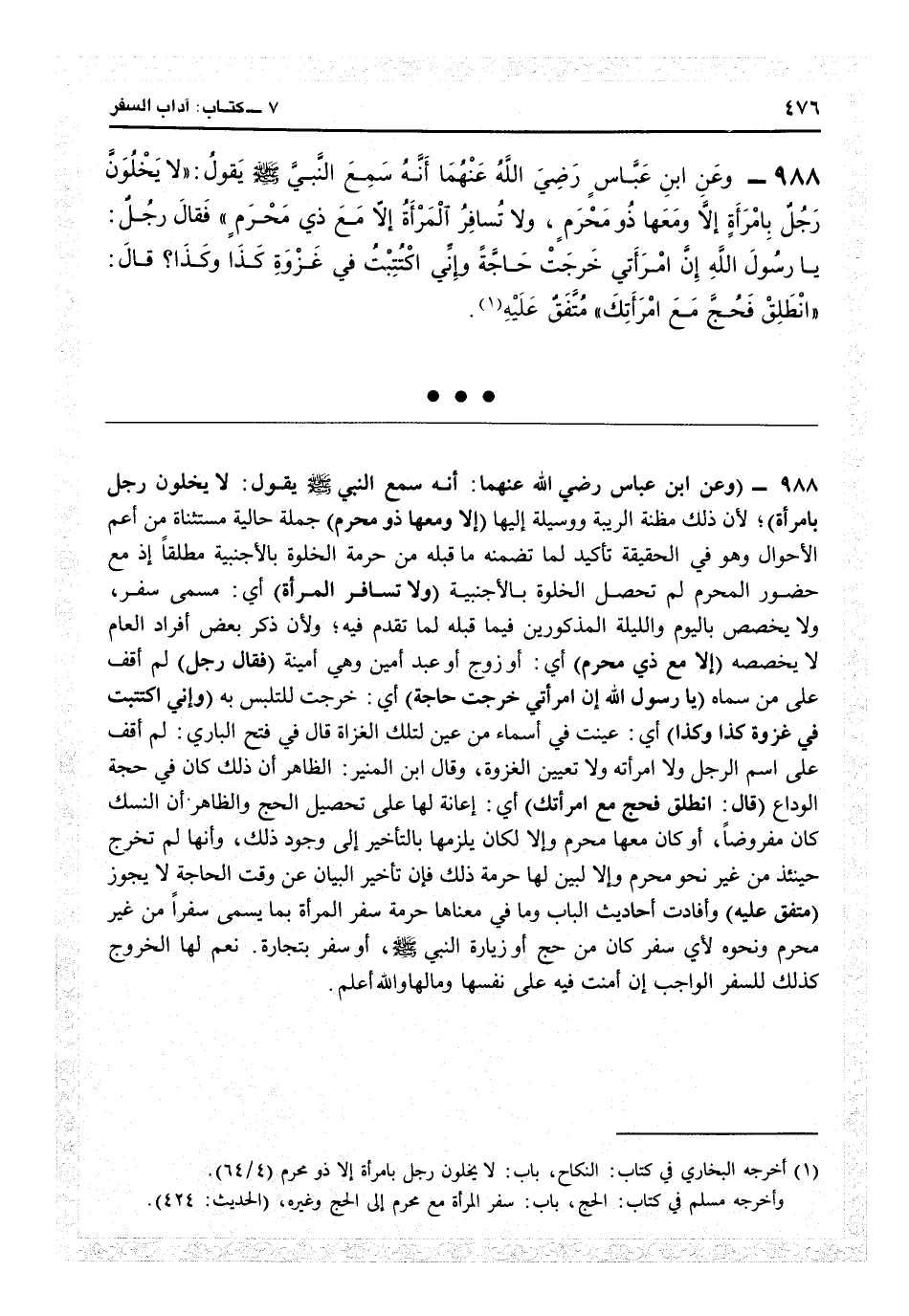 2990 - (وعن ابن عباس رضي الله عنهما أنه سمع النبي يقول: لا يخلون رجل بامرأة) لأن ذلك مظنة الريبة ووسيلة إليها (إلا ومعها ذو محرم) حملة حالية مستثناة من أعم الأحوال، وهو في الحقيقة تأكيد لما تضمنه ما قبله من حرمة الخلوة بالأجنبية مطلقاً، إذ مع حضور المحرم لم تحصل الخلوة بالأجنبية (ولا تسافر المرأة) أي مسمى سفره، ولا يخصص باليوم والليلة المذكورين فيما قبله لما تقدم فيه ولأن ذكر بعض أفراد العام لا يخصصه (إلا مع ذي محرم) أي أو زوج أو عبد أمين وهي أمينة (فقال رجل) لم أقف على من سماه (يا رسول الله إن امرأتي خرجت حاجة) أي خرجت للتلبس به (وإني اكتتبت في غزوة كذا وكذا) أي عينت في أسماء من عين لتلك الغزاة. قال في «فتح الباري» : لم أقف على اسم الرجل ولا امرأته ولا تعيين الغزوة. وقال ابن المنير: الظاهر أن ذلك كان في حجة الوداع (قال: انطلق فحج مع امرأتك) أي إعانة لها على تحصيل الحج، والظاهر أن النسك كان مفروضاً أو كان معها محرم وإلا لكان يلزمها بالتأخير إلى وجود ذلك، وأنها لم تخرج حينئذ من غير نحو محرم وإلا لبين لها حرمة ذلك، فإن تأخير البيان عن وقت الحاجة لا يجوز (متفق عليه) .
