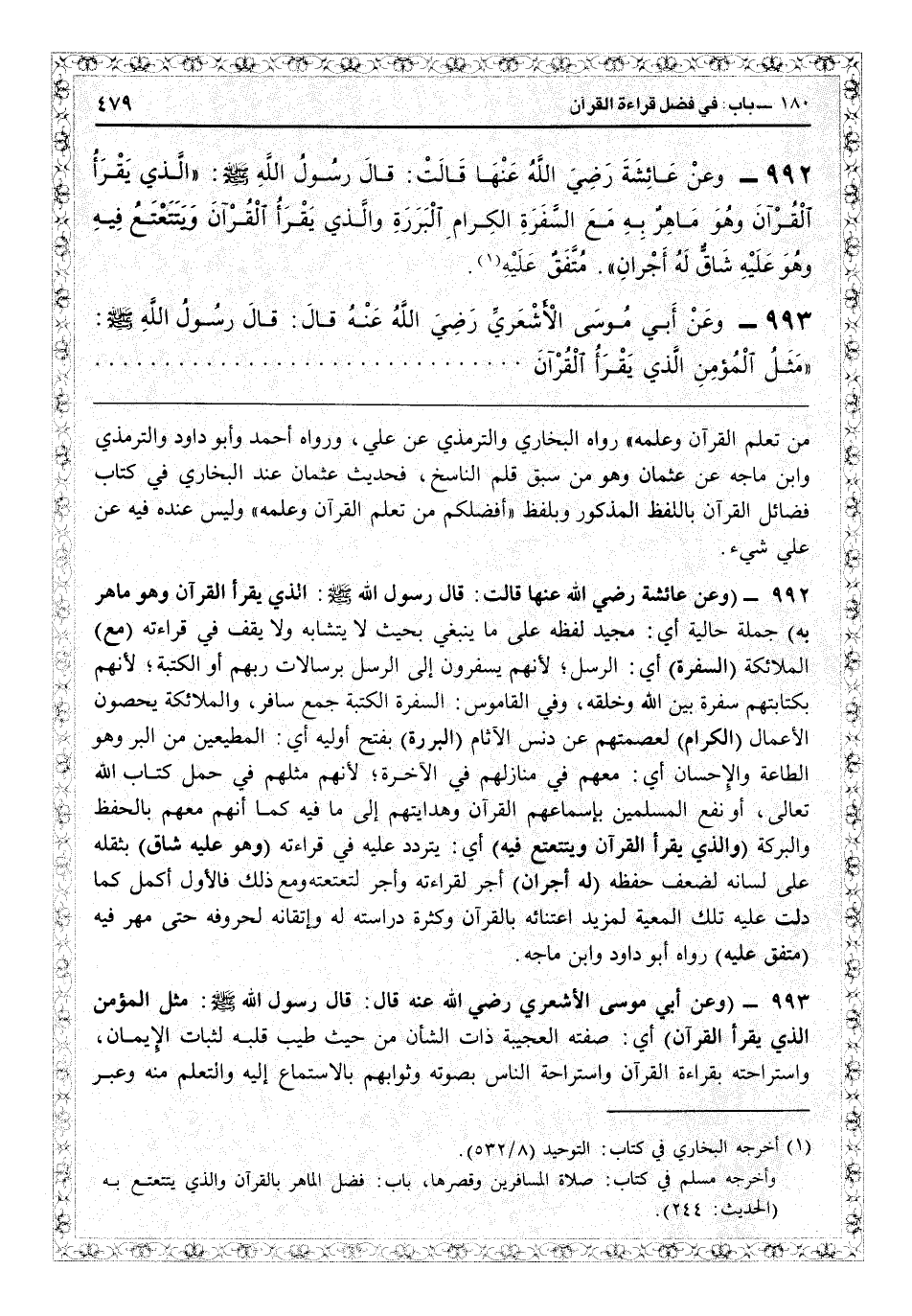 من تعلم القرآن وعلمه» رواه البخاري والترمذي عن علي، ورواه أحمد وأبو داود والترمذي وابن ماجه عن عثمان وهو من سبق قلم الناسخ، فحديث عثمان عند البخاري في كتاب فضائل القرآن باللفظ المذكور، وبلفظ «أفضلكم من تعلم القرآن وعلمه» وليس عنده فيه على شيء.