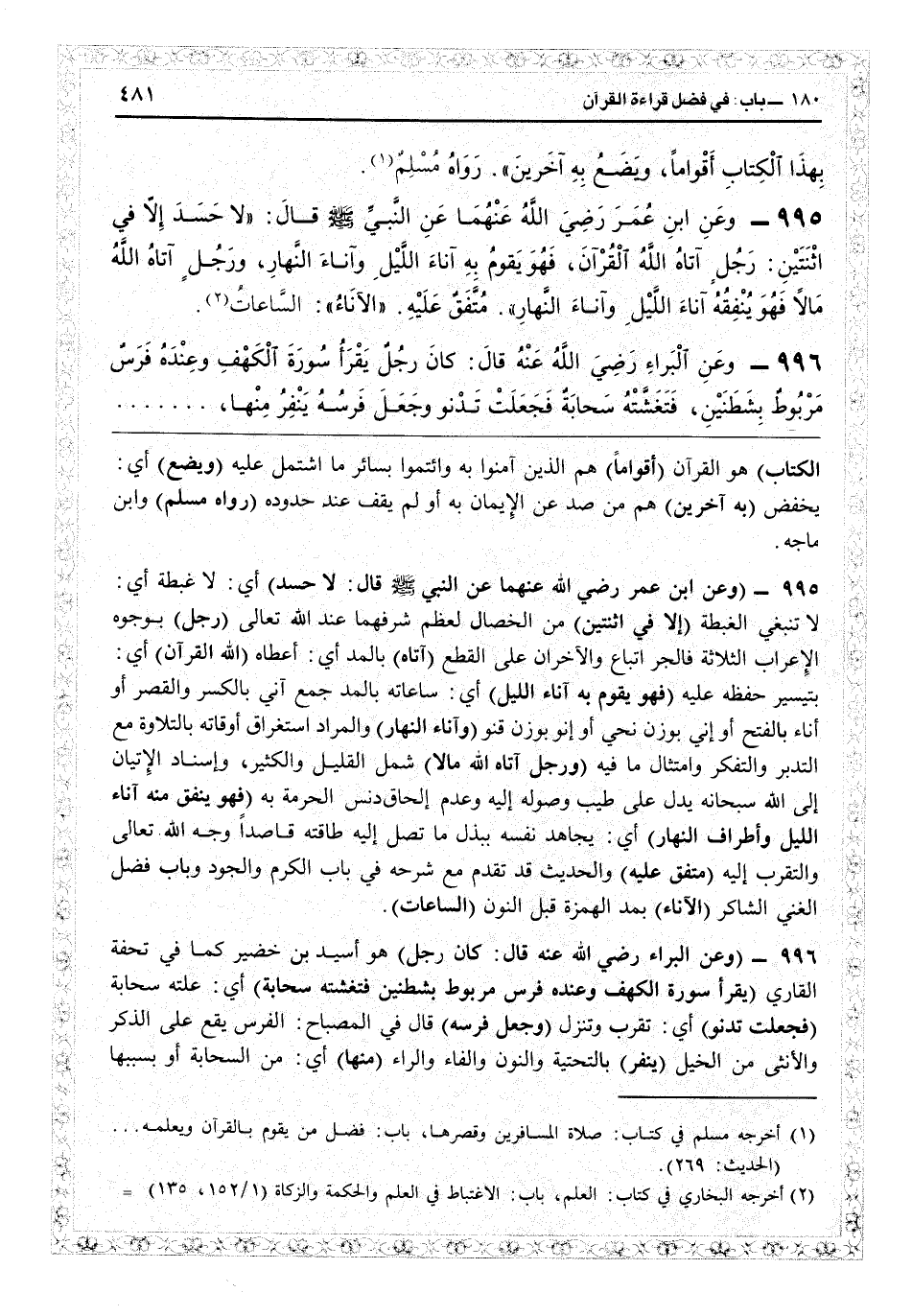7997 - (وعن ابن عمر رضي الله عنهما عن النبي قال: لا حسد) أي لا غبطة: أي لا تنبغي الغبطة (إلا في اثنتين) من الخصال لعظم شرفهما عند الله تعالى (رجل) بوجوه الإعراب الثلاثة فالجرّ إتباع والآخران على القطع (آتاه) بالمد: أي أعطاه (الله القرآن) أي بتيسير حفظه عليه (فهو يقوم به آناء الليل) أي ساعاته بالمد جمع إني بالكسر والقصر أو أنا بالفتح أو إني بوزن نحى أو إنو بوزن قنو (وآناء النهار) والمراد استغراق أوقاته بالتلاوة مع التدبر والتفكر وامتثال ما فيه (ورجل آتاه الله مالاً) شمل القليل والكثير وإسناد الإتيان إلى الله سبحانه يدل على طيب وصوله إليه وعدم لحاق دنس الحرمة به (فهو ينفق منه آناء الليل وأطراف النهار) أي يجاهد نفسه ببذل ما تصل إليه طاقته قاصداً وجه الله تعالى والتقرب. إليه (متفق عليه) والحديث قد تقدم مع شرحه في باب الكرم والجود وباب فضل الغنيّ الشاكر (الآناء) يمد الهمزة قبل النون (الساعات) .