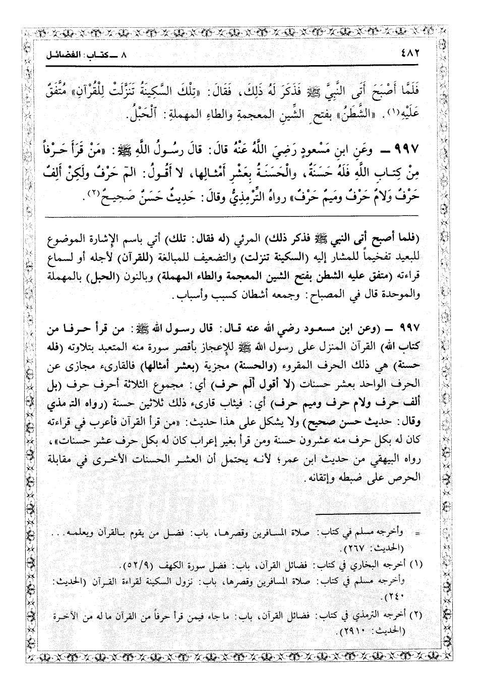 9999 - (وعن ابن مسعود رضي الله عنه قال: قال رسول الله: من قرأ حرفاً من كتاب الله) القرآن المنزل على رسول الله للإعجاز بأقصر سورة منه المتعبد بتلاوته (فله حسنة) هي ذلك الحرف المقروء (والحسنة) مجزية (بعشر أمثالها) فالقارىء مجازى عن الحرف الواحد بعشر حسنات (لا أقول الم حرف) أي لا أقول إن مجموع الأحرف الثلاثة حرف (بل ألف حرف ولام حرف وميم حرف) أي فيثاب قارىء ذلك ثلاثين حسنة (رواه الترمذي وقال: حديث حسن صحيح) ولا يشكل على هذا حديث «من قرأ القرآن فأعرب في قراءته كان له بكل حرف منه عشرون حسنة، ومن قرأ بغير إعراب كان له بكل حرف عشر حسنات» رواه البيهقي من حديث ابن عمر لأنه يحتمل أن العشر الحسنات الأخرى في مقابلة الحرص على ضبطه وإتقانه.
