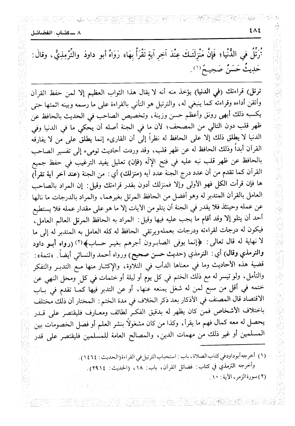 ترتل) قراءتك (في الدنيا) يؤخذ منه أنه لا يقال هذا الثواب العظيم إلا لمن حفظ القرآن وأتقن أداءه وقراءته كما ينبغي له، والترتيل هو التأني بالقراءة على ما رسمه وبينه أئمتنا حتى يكسبه ذلك أبهى رونق وأعظم حسن وزينة، وتخصيص الصاحب في الحديث بالحافظ عن ظهر قلب دون التالي من المصحف، لأن ما في الجنة أصله أن يحكى ما في الدنيا، وفي الدنيا لا يطلق ذلك إلا على الحافظ له، نظراً إلى أن القارىء إنما يطلق على من لا يفارقه القرآن أبداً، وذلك الحافظ له عن ظهر قلب، وقد وردت أحاديث تومىء إلى تفسير الصاحب بالحافظ عن ظهر قلب نبه عليه في «فتح الإله»