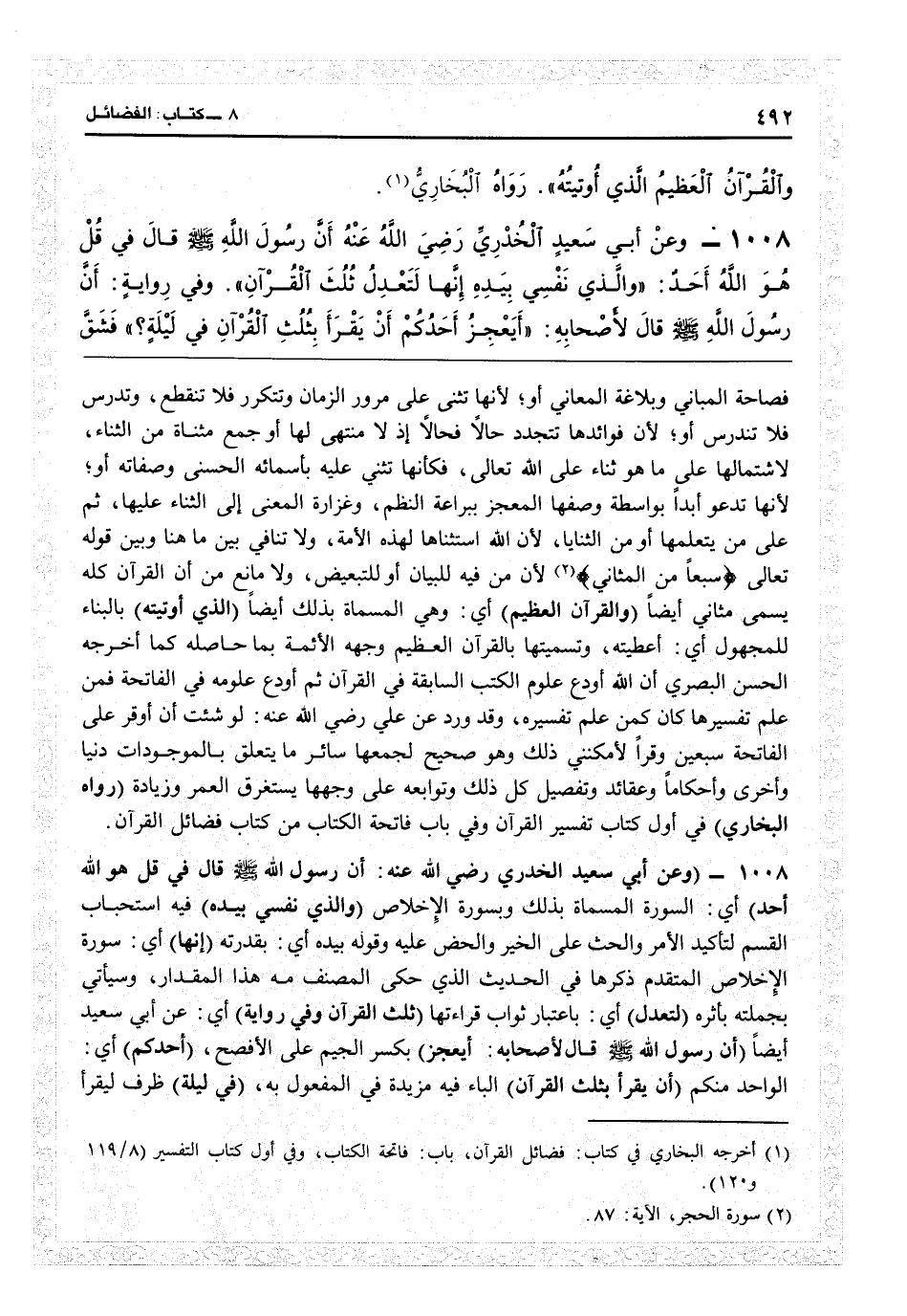 21010 - (وعن أبي سعيد الخدري رضي الله عنه أن رسول الله قال في قل هو الله أحد) أي السورة المسماة بذلك وبسورة الإخلاص (والذي نفسي بيده) فيه استحباب القسم لتأكيد الأمر والحث على الخير والحض عليه، وقوله بيده: أي بقدرته (إنها) أي سورة الإخلاص المتقدم ذكرها في الحديث الذي حكى المصنف منه هذا المقدار وسيأتي بجملته بأثره (لتعدل) أي باعتبار ثواب قراءتها (ثلث القرآن. وفي رواية) أي عن أبي سعيد أيضاً (أن رسول الله قال لأصحابه: أيعجز) بكسر الجيم على الأفصح (أحدكم) أي الواحد منكم (أن يقرأ بثلث القرآن) الباء فيه مزيدة في المفعول به (في ليلة) ظرف ليقرأ
