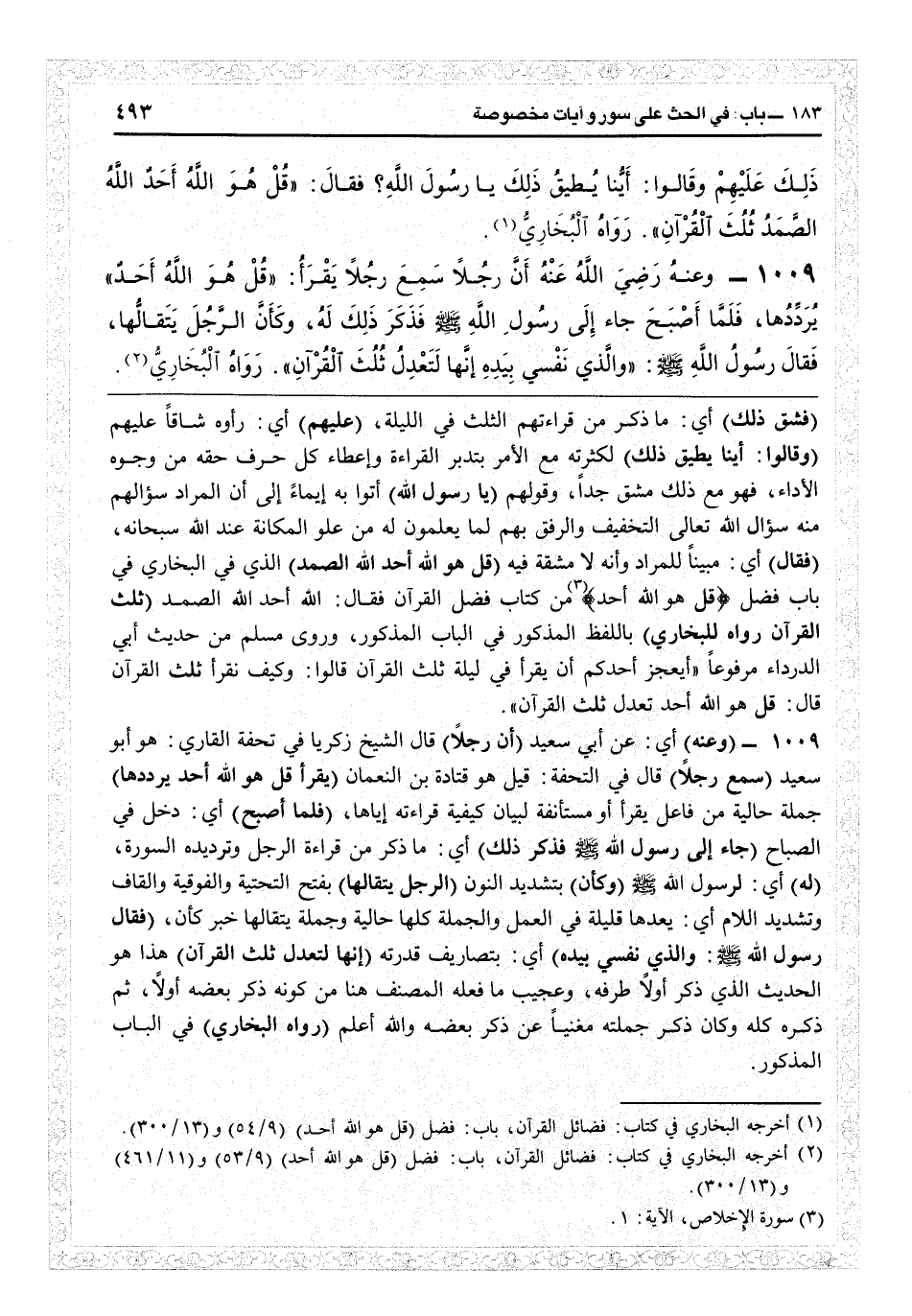 (فشق ذلك) أي ما ذكر من قراءتهم الثلث في الليلة (عليهم) أي رأوه شاقاً عليهم (وقالوا: أينا يطيق ذلك) لكثرته مع الأمر بتدبر القراءة وإعطاء كل حرف حقه من وجوه الأداء فهو ذلك مشقّ جداً، وقولهم (يا رسول الله) أتوا به إيماء إلى أن المراد سؤالهم منه سؤال الله تعالى التخفيف والرفق بهم لما يعلمون له من علوّ المكانة عند الله سبحانه (فقال) أي مبيناً للمراد وأنه لا مشقة فيه (قل هو الله أحد الله الصمد) الذي في البخاري في باب فضل {قل هو الله أحد} من كتاب «فضل القرآن» فقال {الله أحد الله الصمد} (ثلث القرآن. رواه البخاري) باللفظ المذكور في الباب المذكور، وروى مسلم من حديث أبي الدرداء مرفوعاً «أيعجز أحدكم أن يقرأ في ليلة ثلث القرآن؟ قالوا: وكيف نقرأ ثلث القرآن؟ قال: {قل هو الله} أحد تعدل ثلث القرآن»