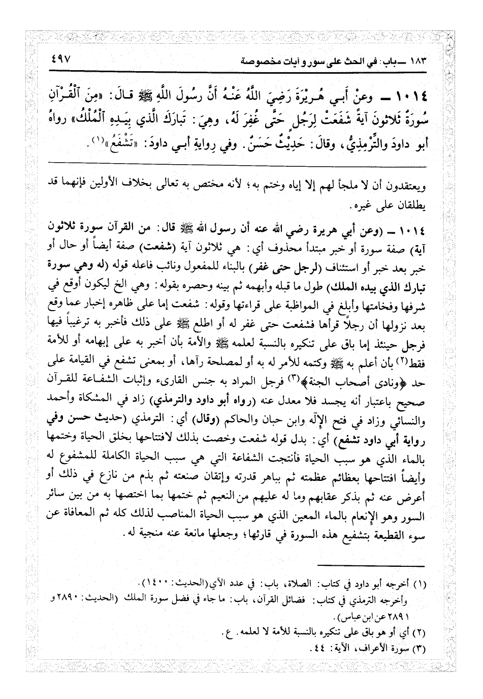 81016 - (وعن أبي هريرة رضي الله عنه أن رسول الله قال: من القرآن سورة ثلاثون آية) صفة سورة أو خبر مبتدأ محذوف: أي هي ثلاثون أية (شفعت) صفة أيضاً أو حال أو خبر بعد خبر أو استئناف (لرجل حتى غفر) بالبناء للمفعول ونائب فاعله قوله (له وهي سورة تبارك الذي بيده الملك) طوّل ما قبله وأبهمه ثم بينه وحصره بقوله وهي الخ ليكون أوقع في شرفها وفخامتها وأبلغ في المواظبة على قراءتها، وقوله شفعت إما على ظاهره إخبار عما وقع بعد نزولها أن رجلاً قرأها فشفعت حتى غفر له، أو اطلع على ذلك فأخبر به ترغيباً فيها، فرجل حينئذ إما باق على تنكيره بالنسبة لعلمه والأمة بأن أخبر به على إبهامه أو للأمة فقط؟ بأن أعلم به وكتمه للأمر له به أو لمصلحة رآها، أو بمعنى تشفع في القيامة على حد {ونادى أصحاب الجنة} (الأعراف: 44) فرجل المراد به جنس القارىء وإثبات الشفاعة للقرآن صحيح باعتبار أنه يجسد فلا معدل عنه (رواه أبو داود والترمذي) زاد في «المشكاة» وأحمد والنسائي وزاد في «فتح الإله» وابن حبان والحاكم (وقال) أي الترمذي (حديث حسن) .