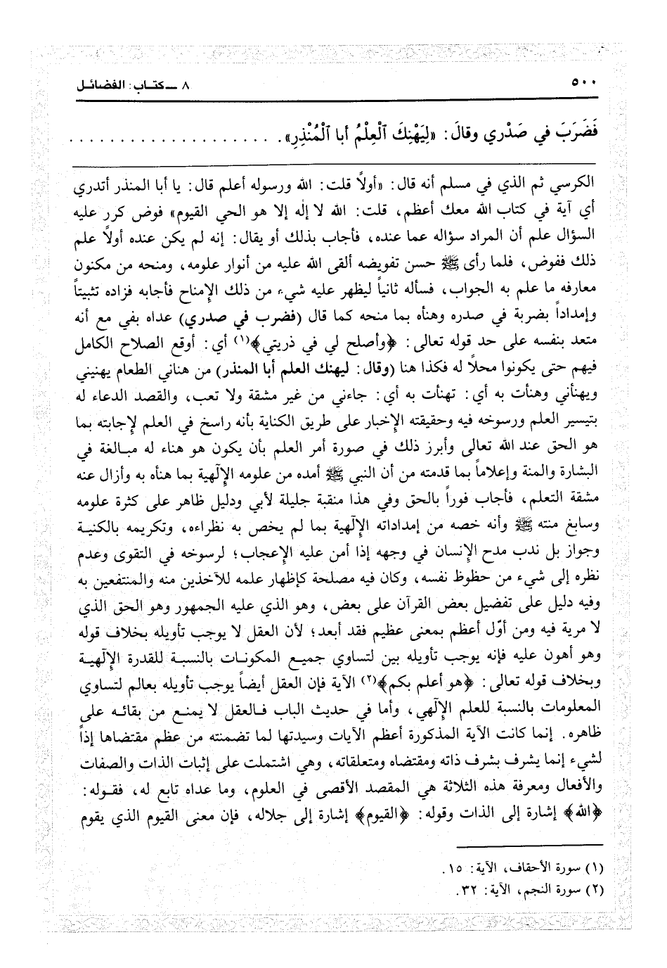 {هو أعلم بكم} (النجم: 32) الآية، فإن العقل أيضاً يوجب تأويله بعالم لتساوي المعلومات بالنسبة للعلم الإلهي، وأما في حديث الباب فالعقل لا يمنع من بقائه على ظاهره، إنما كانت الآية المذكورة أعظم الآيات وسيدتها لما تضمنته من عظم مقتضاها، إذ الشيء إنما يشرف بشرف ذاته ومقتضاه ومتعلقاته، وهي اشتملت على إثبات الذات والصفات والأفعال، ومعرفة هذه الثلاثة هي المقصد الأقصى في العلوم معنى القيوم الذي يقوم