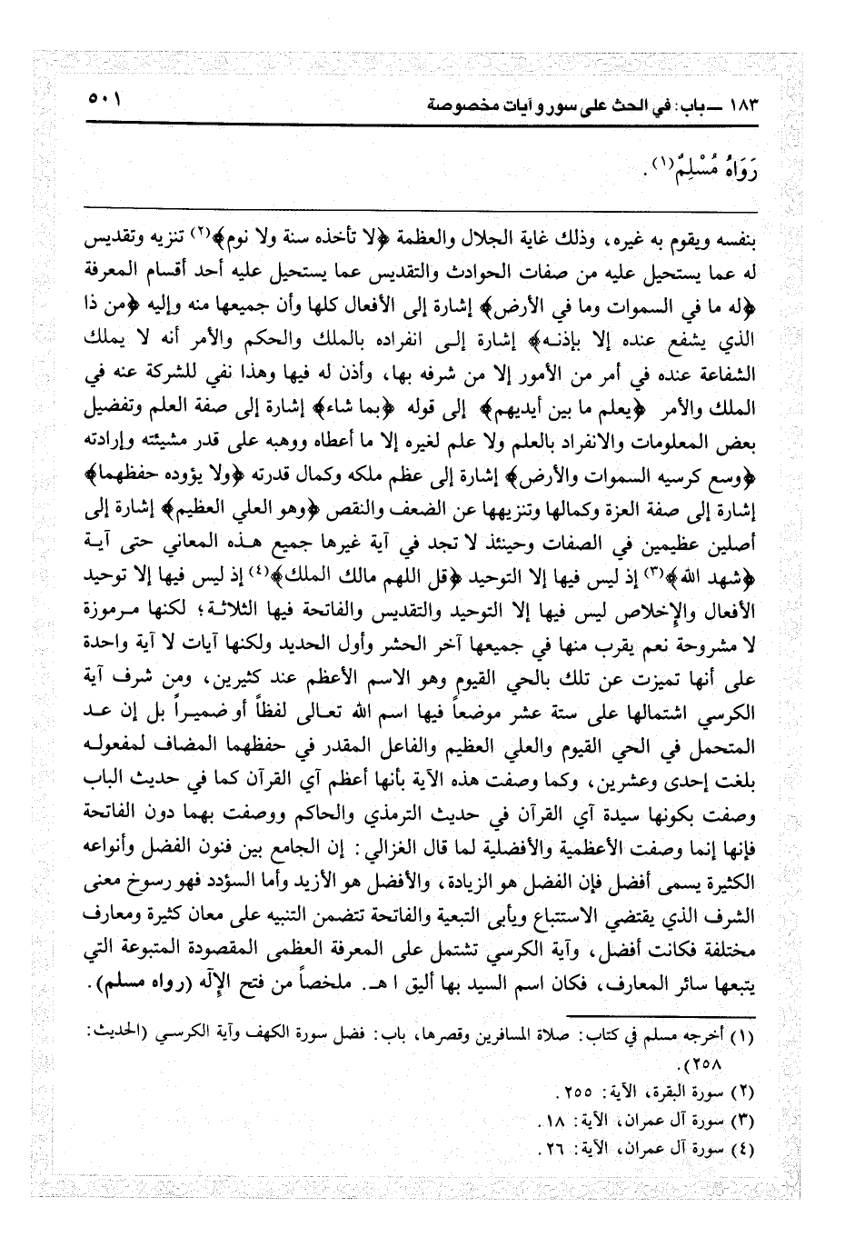 في حفظهما المضاف لمفعوله بلغت إحدى وعشرين، وكما وصفت هذه الآية بأنها أعظم أي القرآن كما في حديث الباب وصفت بكونها سيدة أي القرآن في حديث الترمذي والحاكم، ووصفت بهما دون الفاتحة، فإنها إنما وصفت بالأعظمية والأفضلية لما قال الغزالي: إن الجامع بين فنون الفضل وأنواعه الكثيرة يسمى أفضل، فإن الفضل هو الزيادة والأفضل هو الأزيد: وأما السؤدد فهو رسوخ معنى الشرف الذي يقتضي الاستتباع ويأتي التبعية، والفاتحة تتضمن التنبيه على معان كثيرة ومعارف مختلفة فكانت أفضل، وآية الكرسي تشتمل على المعرفة العظمى المقصودة المتبوعة التي يتبعها سائر المعارف فكان اسم السيد بها أليق اهـ. ملخصاً من «فتح الإله» (رواه مسلم) .